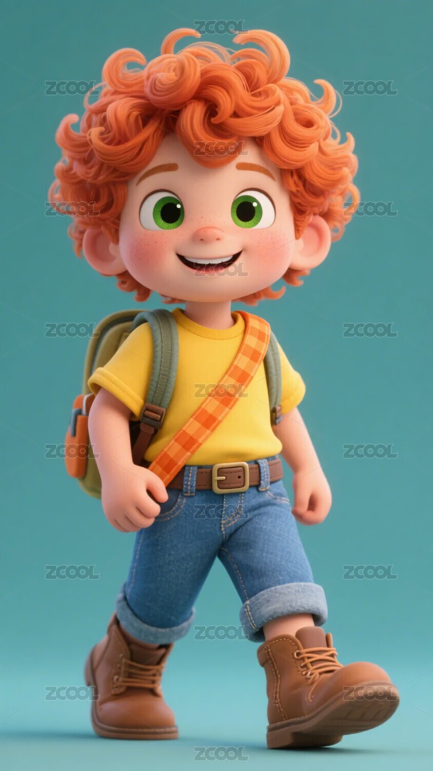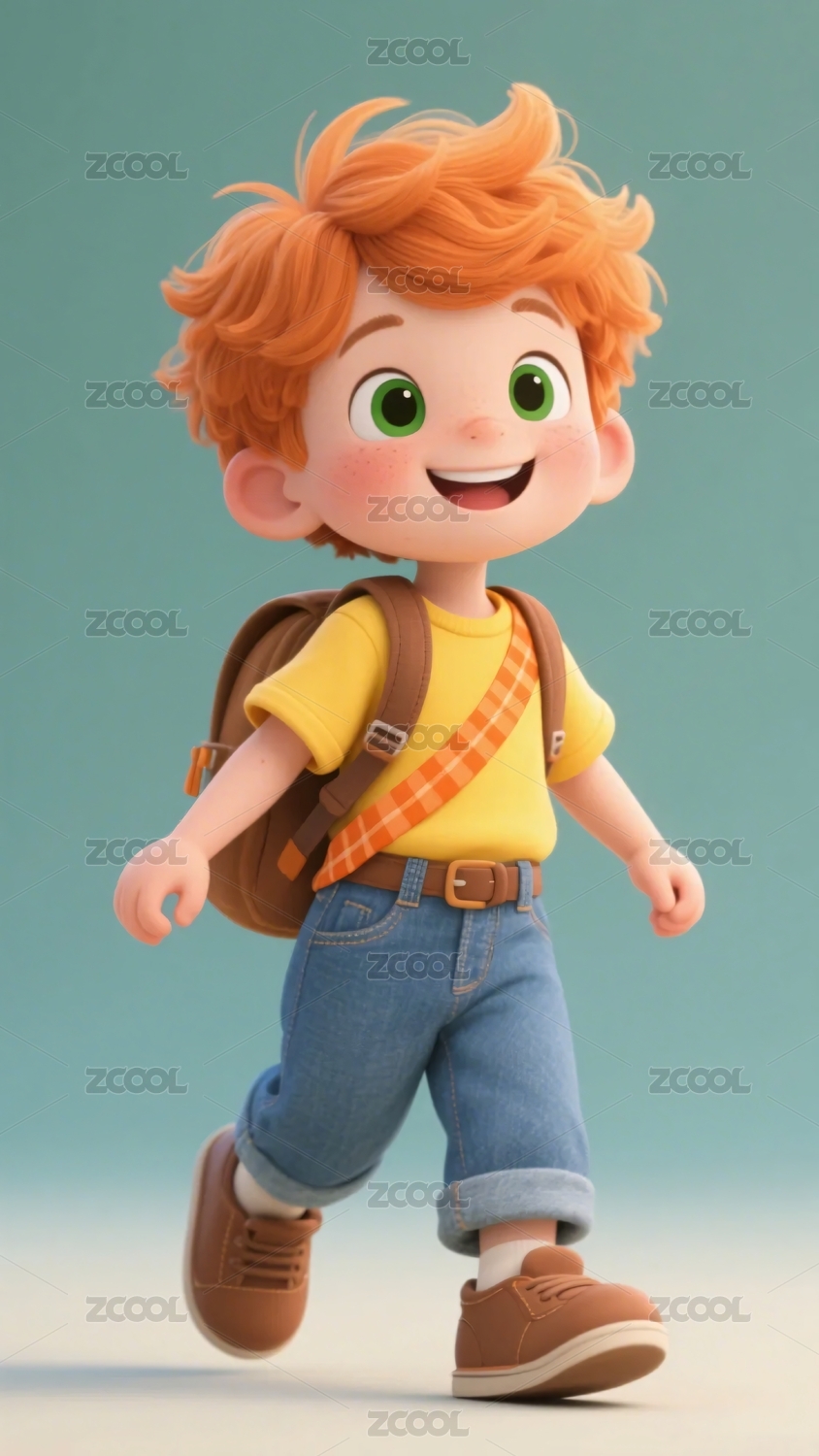 小男孩,红发,书包,插画,卡通,童趣,户外,行走,人物,服装