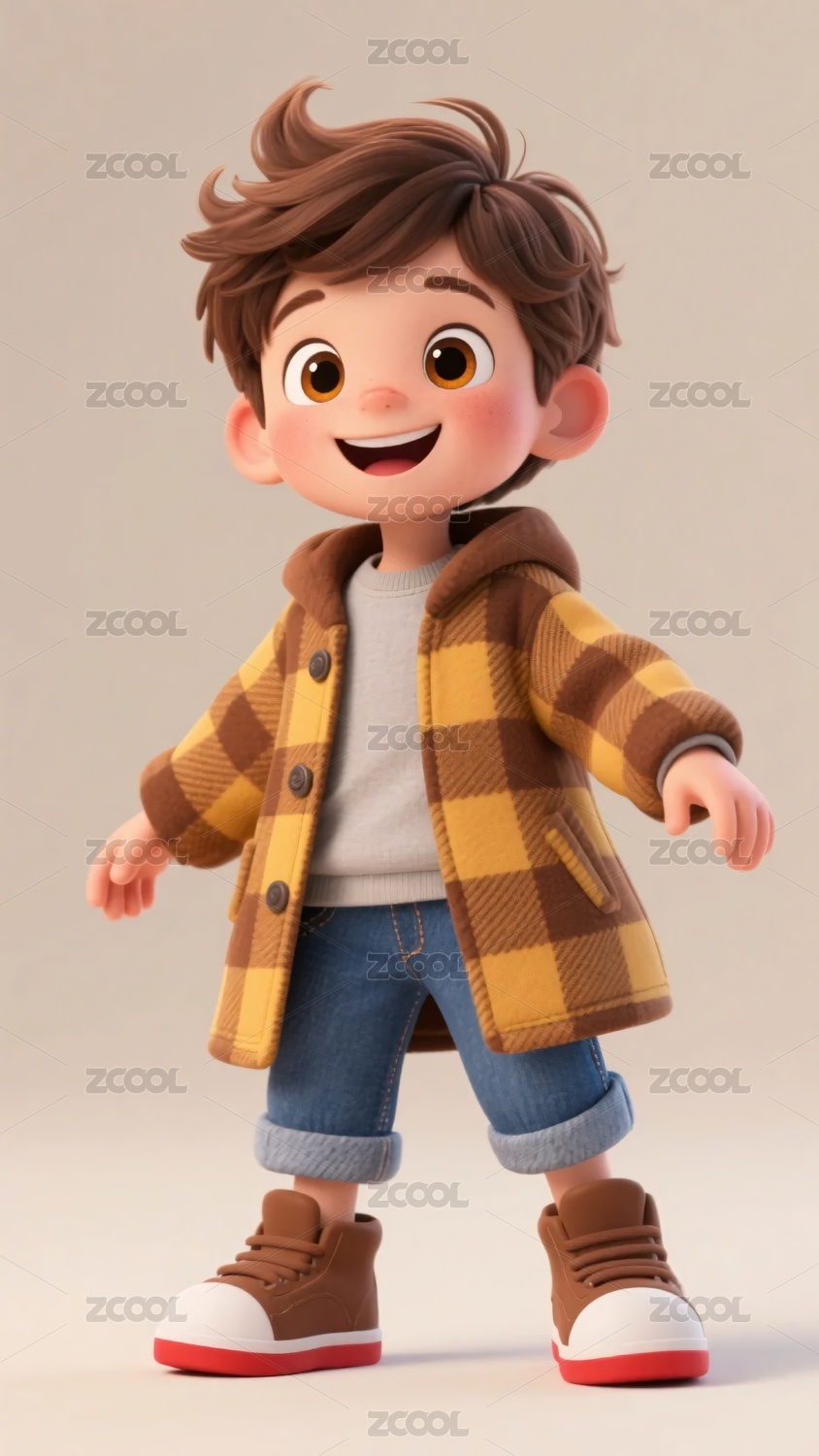 小男孩,卷发,卡通,插画,人物,外套,牛仔裤,鞋子,童趣,服装