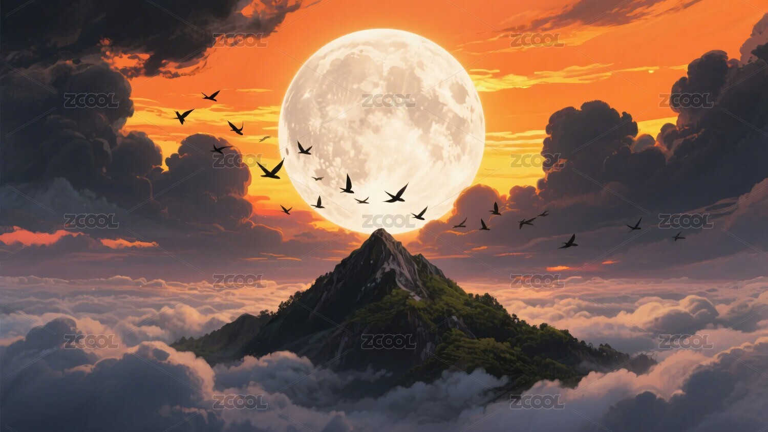 月夜山峰飞鸟壮丽景象