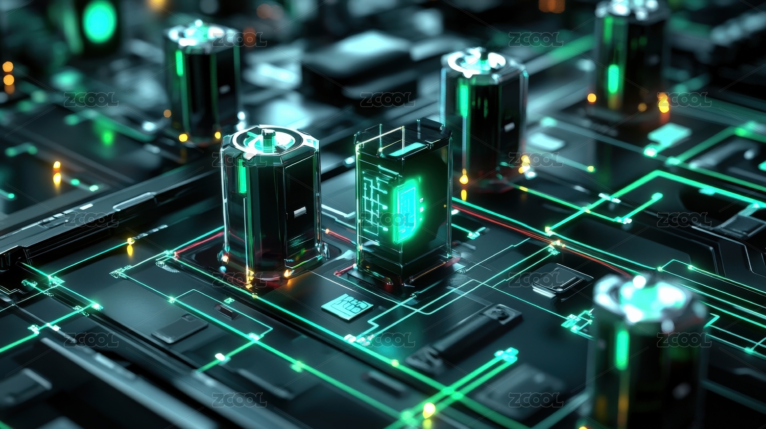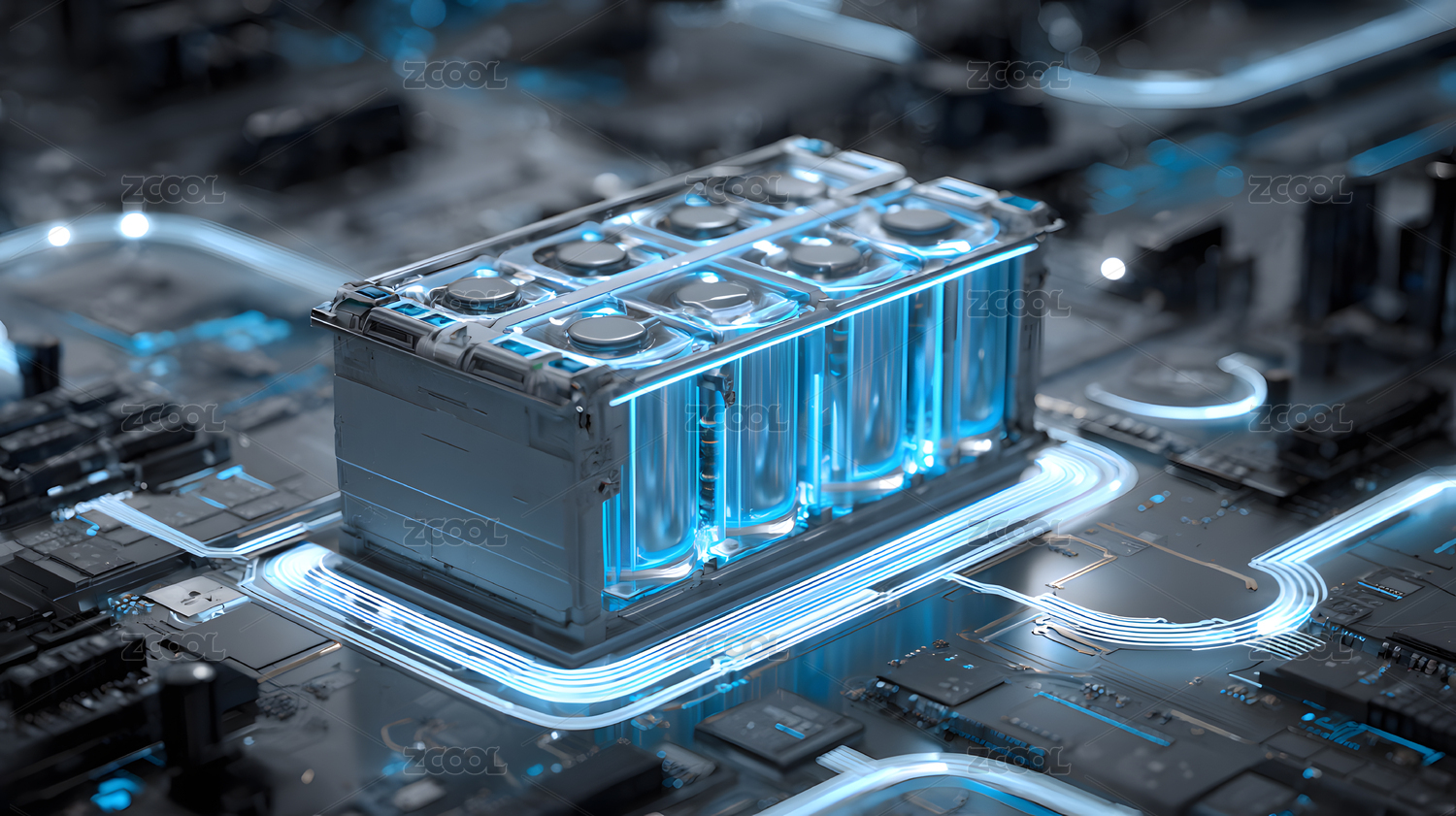 电路板上蓝色电池散发科技光效