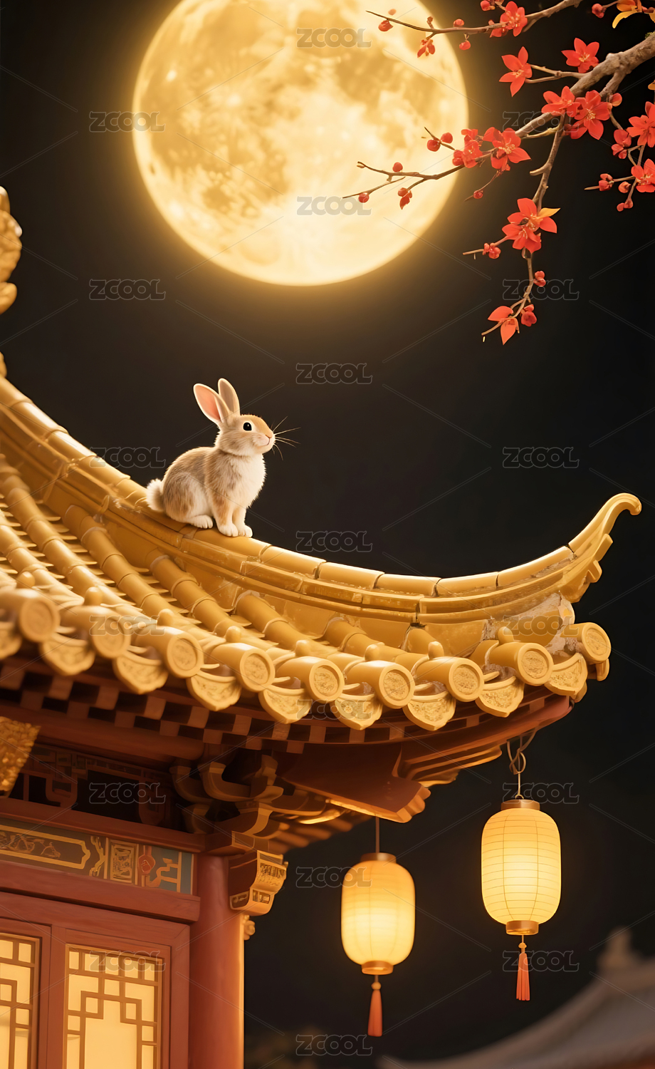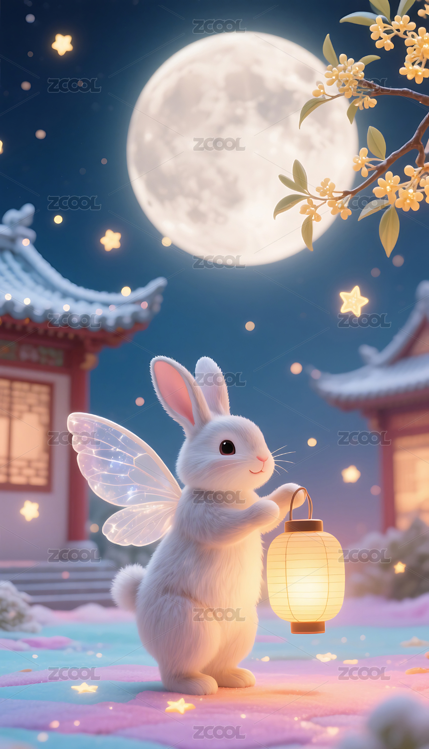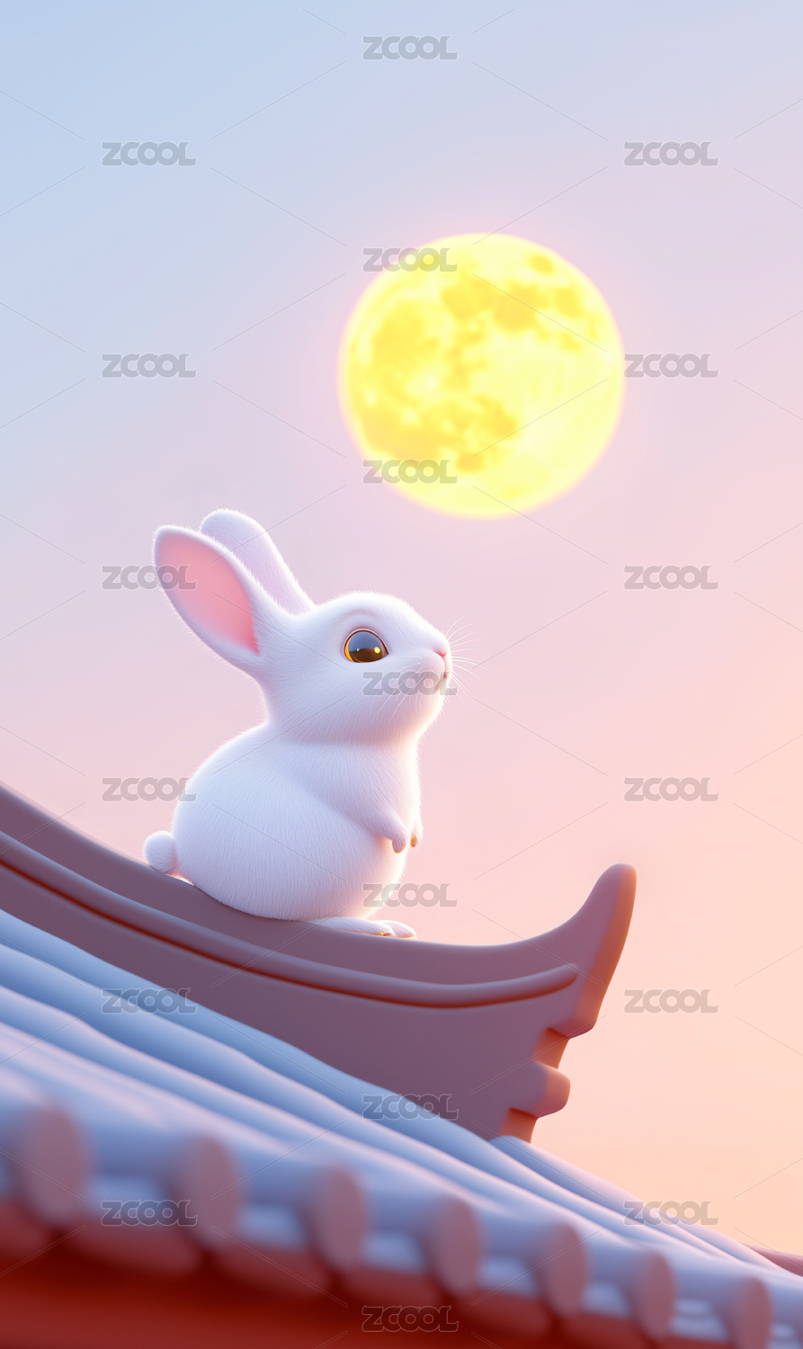 中秋节屋檐上的兔子3D插画
