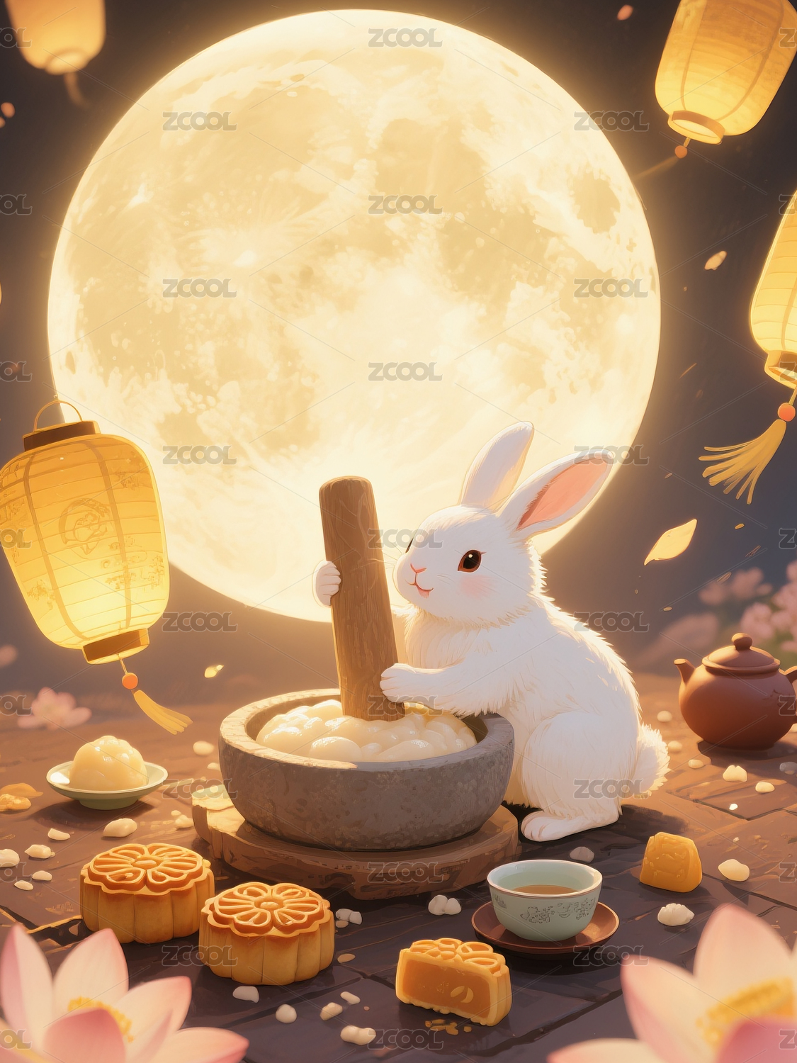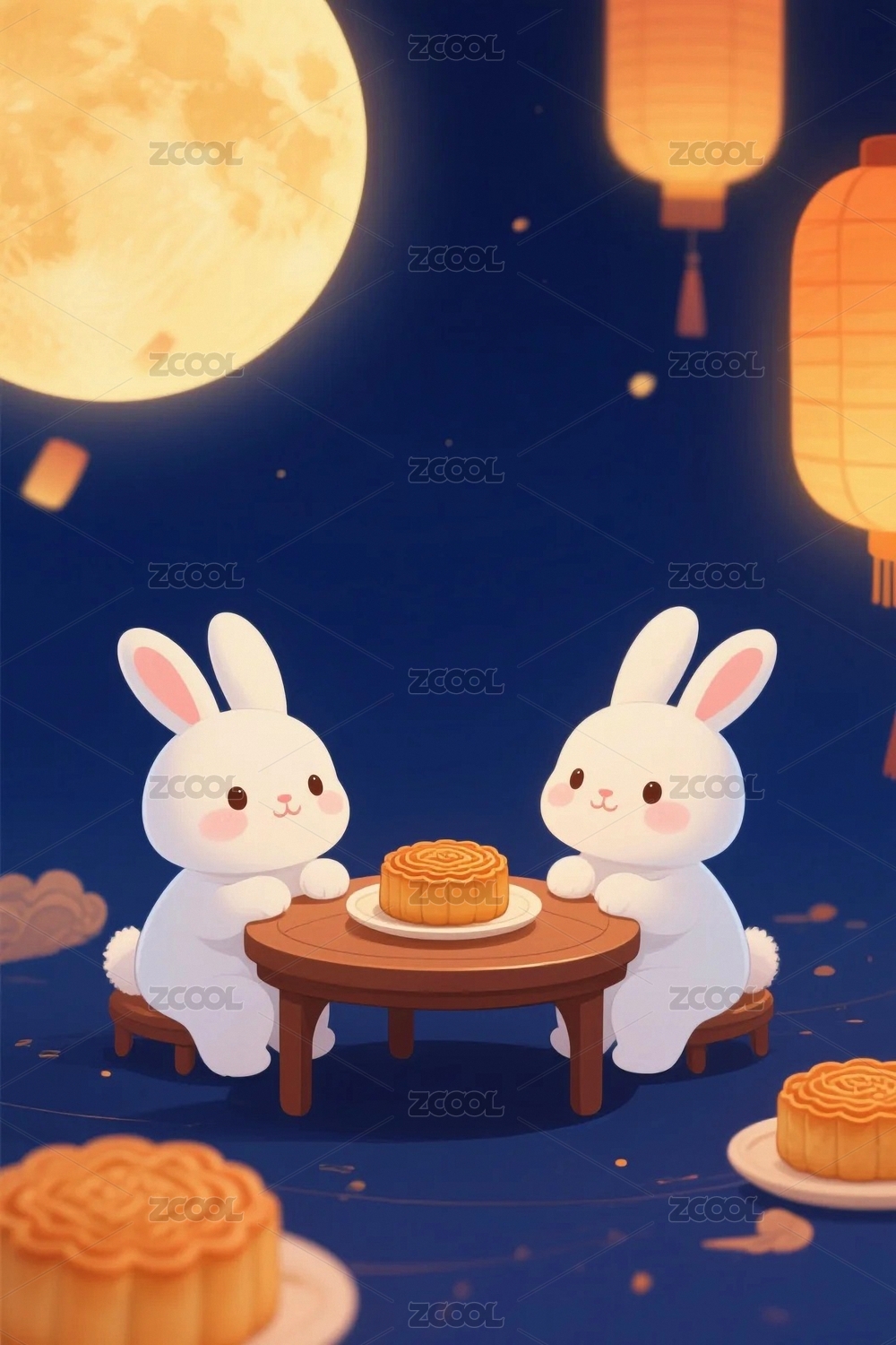 月下玉兔捧茶杯坐于月饼之上