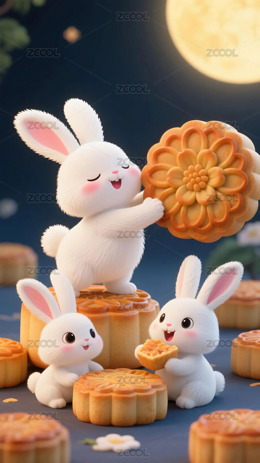 中秋节兔子吃月饼场景