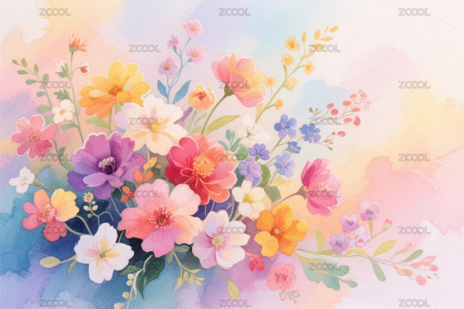 花卉,彩色花卉,水彩画风格,粉色花朵,蓝色花朵,黄色花朵,绿叶,花朵,插画,绘画