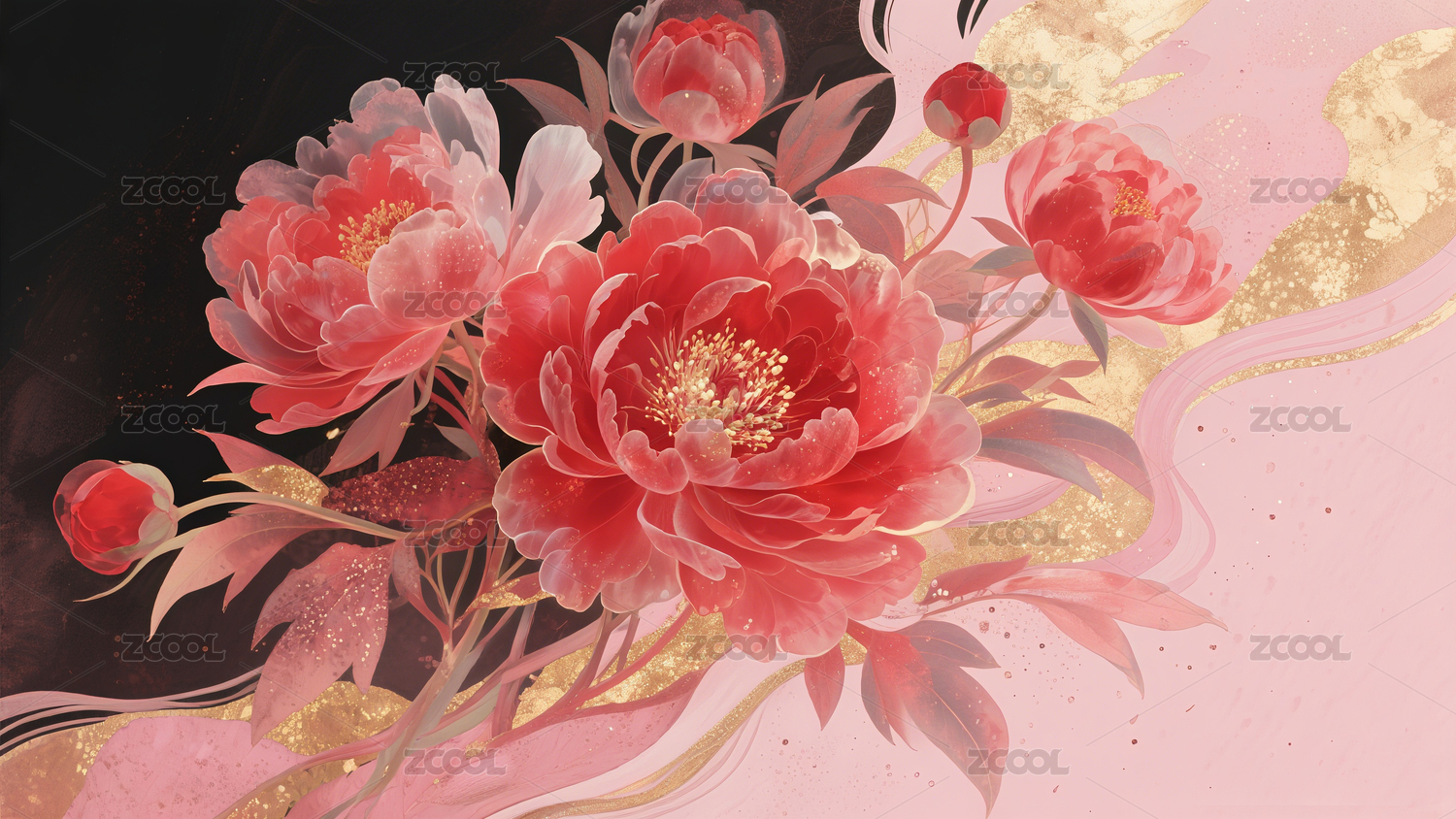 新中式水墨金箔岩彩牡丹花撞色水墨插画