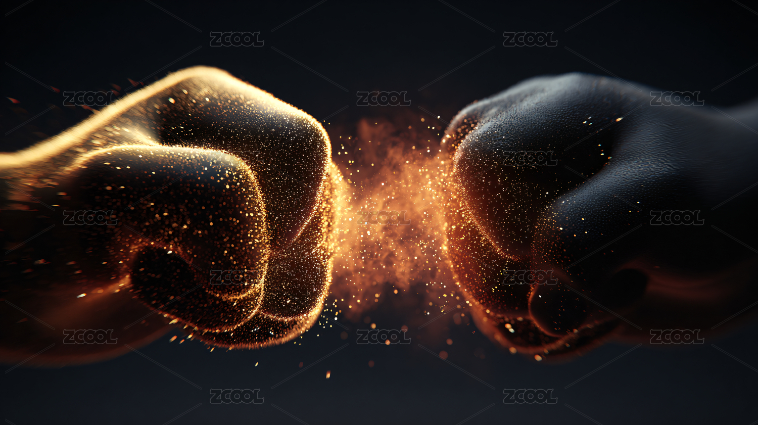夸张能量拳头对打迸溅气浪火光的黑底插画