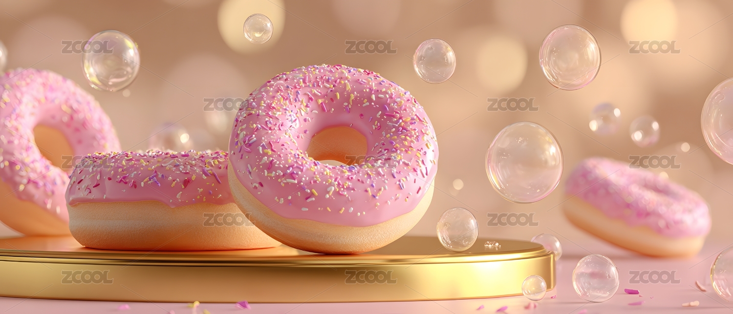粉色甜甜圈置于金色托盘上 梦幻气泡背景