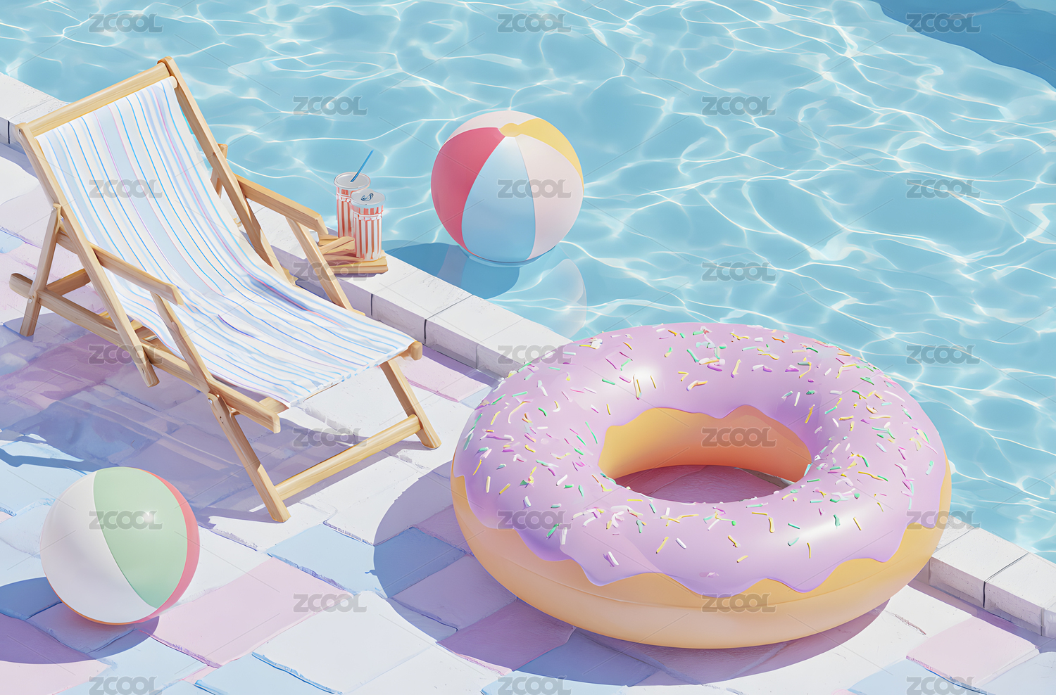 甜甜圈,泳池边,漂浮着,粉色系,梦幻感,悠闲感,夏日风,假日情,甜蜜感,3D效果