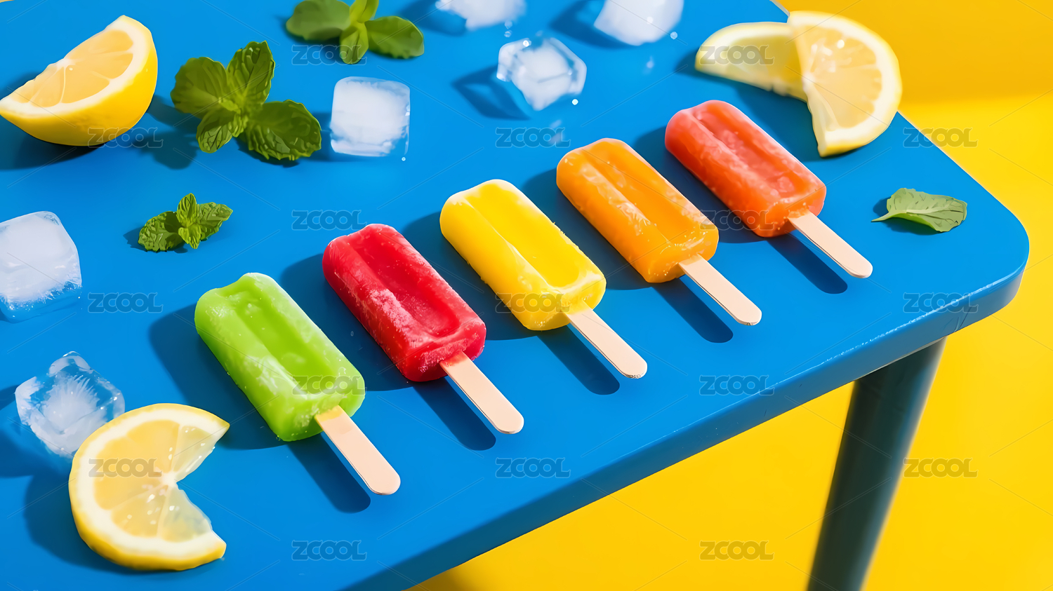 蓝色,食物,红色,绿色,黄色,桌面,排列,冰棒,薄荷,橙子