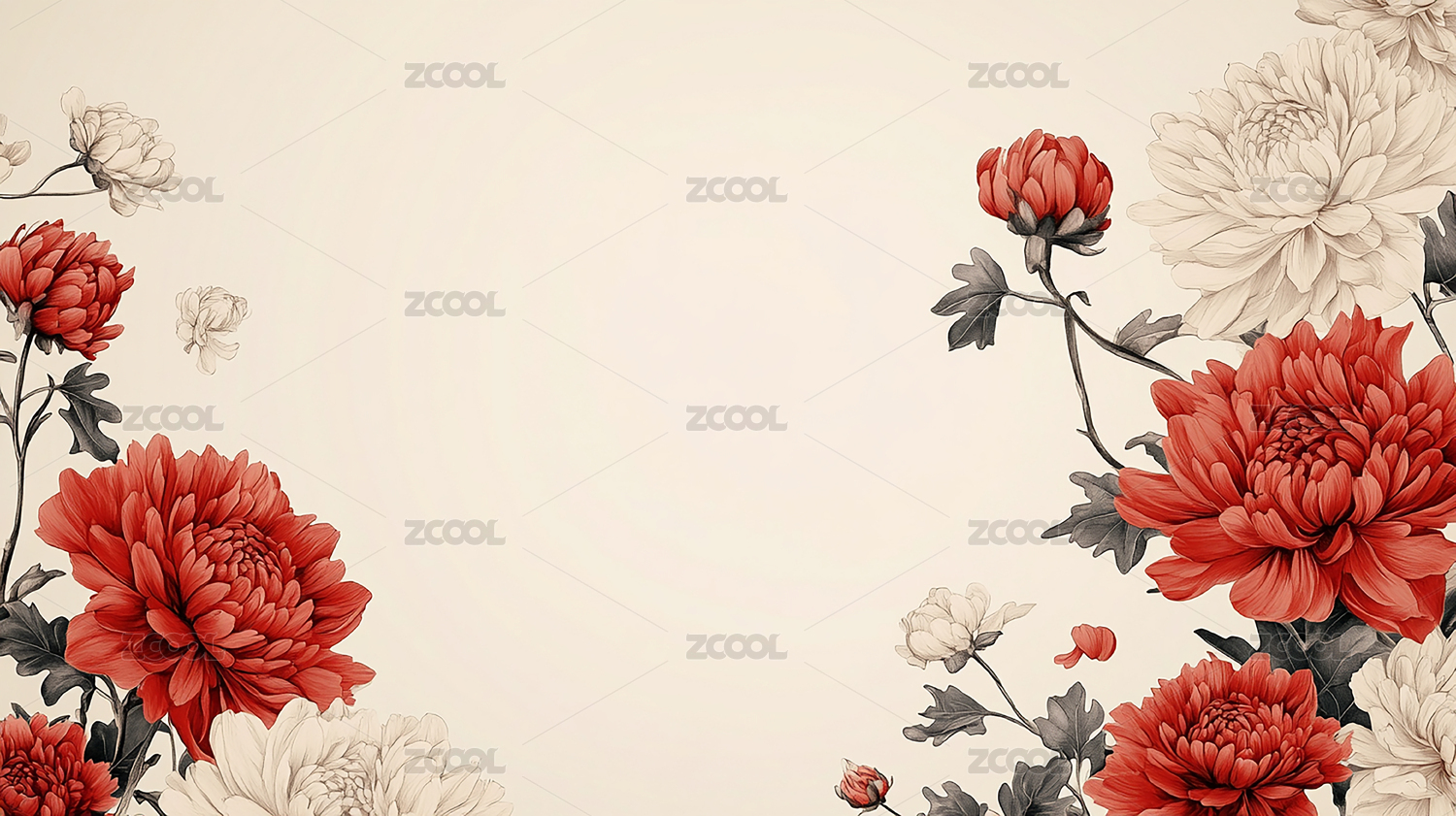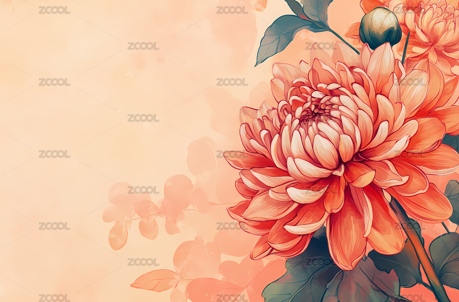 两朵粉菊伴墨叶于淡彩背景