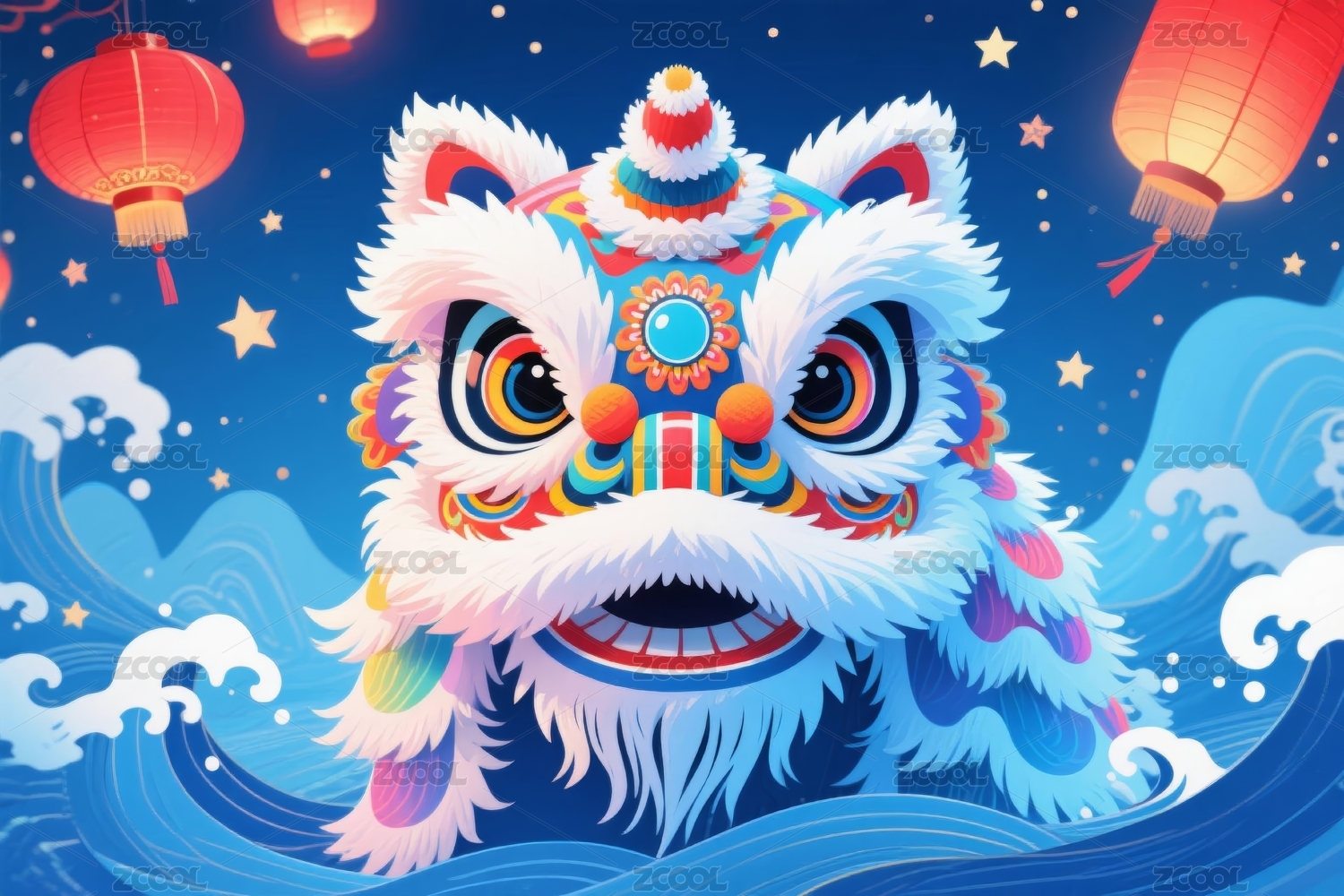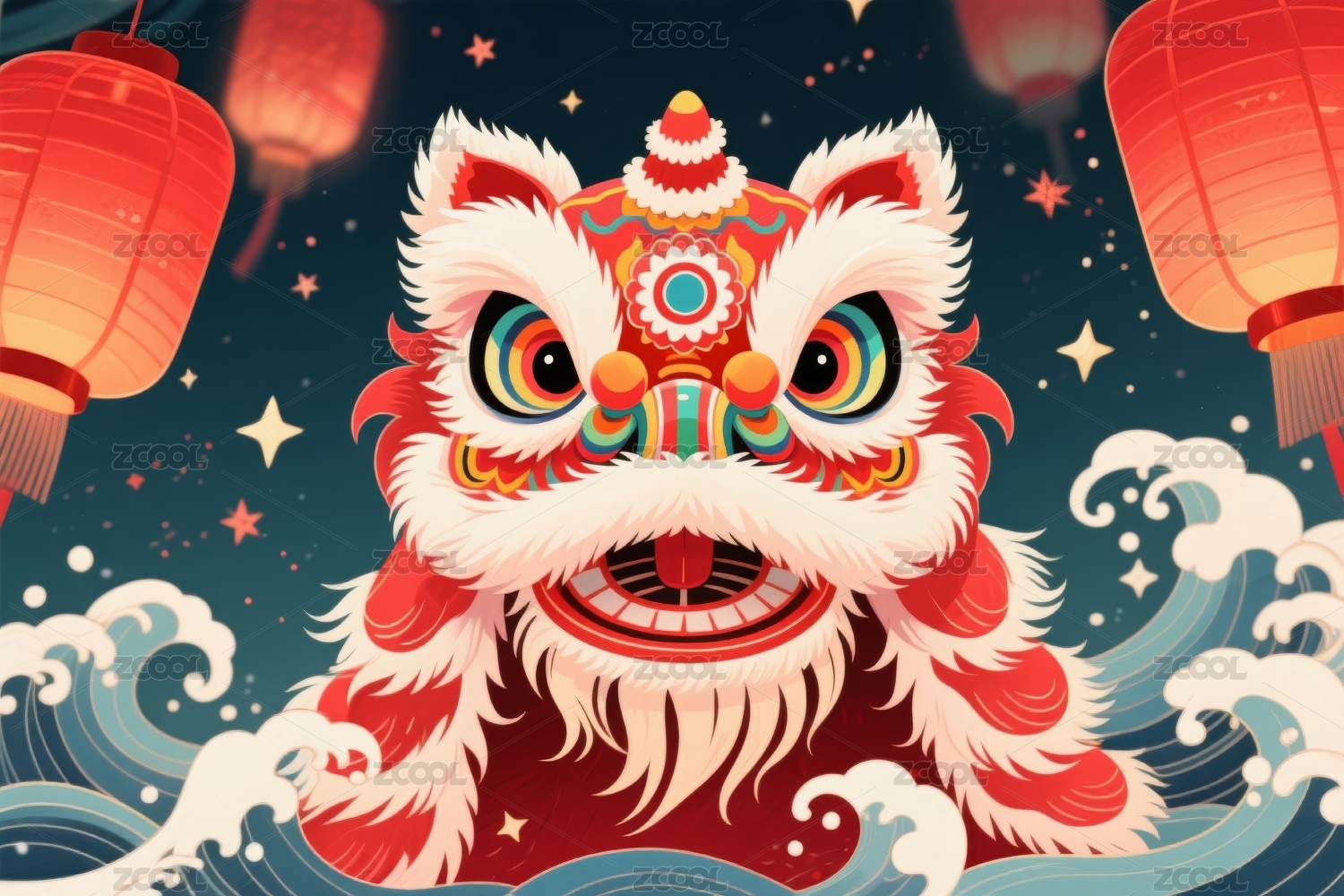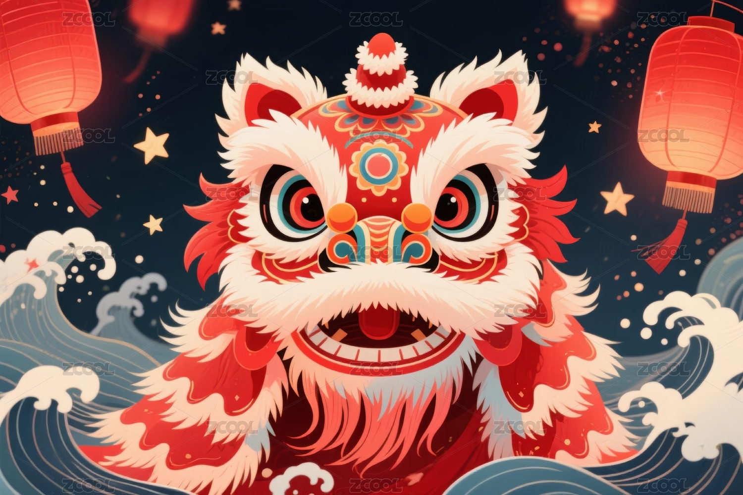 云朵,红色,粉色,节日,金色,灯笼,夜空,舞狮,浓厚,氛围