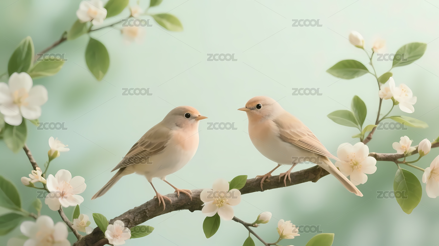 中国风水彩鸟麻雀植物树枝鲜花插画