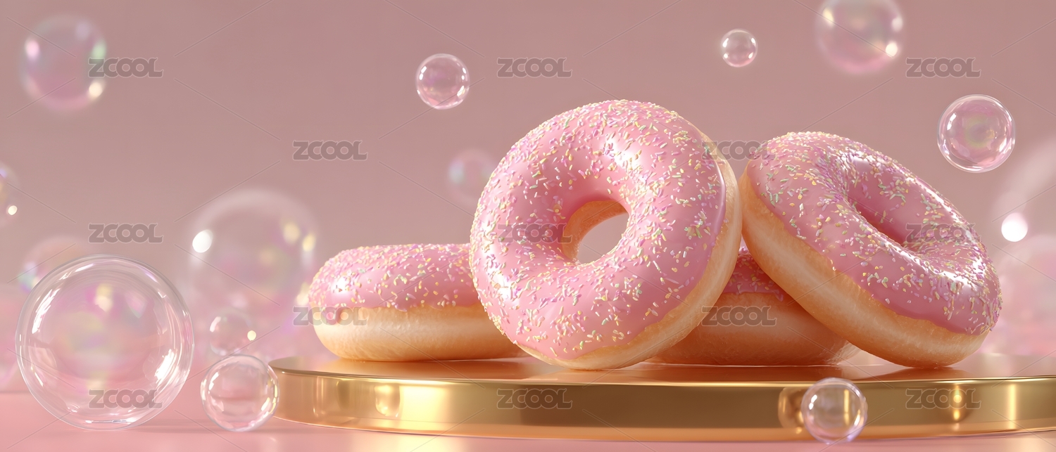 粉色甜甜圈置于金色托盘上 梦幻气泡背景
