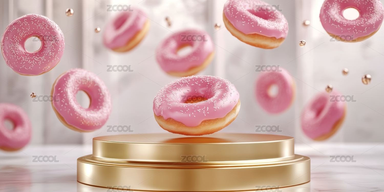 主视觉,场景,光泽,展示,精致,甜甜圈,粉色调,美食,烘焙,甜点