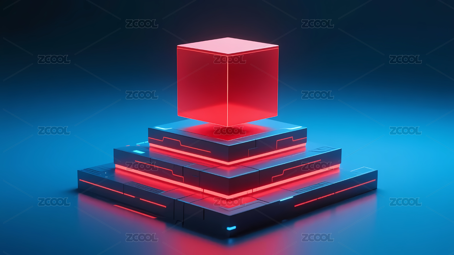 发光红色立方体与金字塔底座