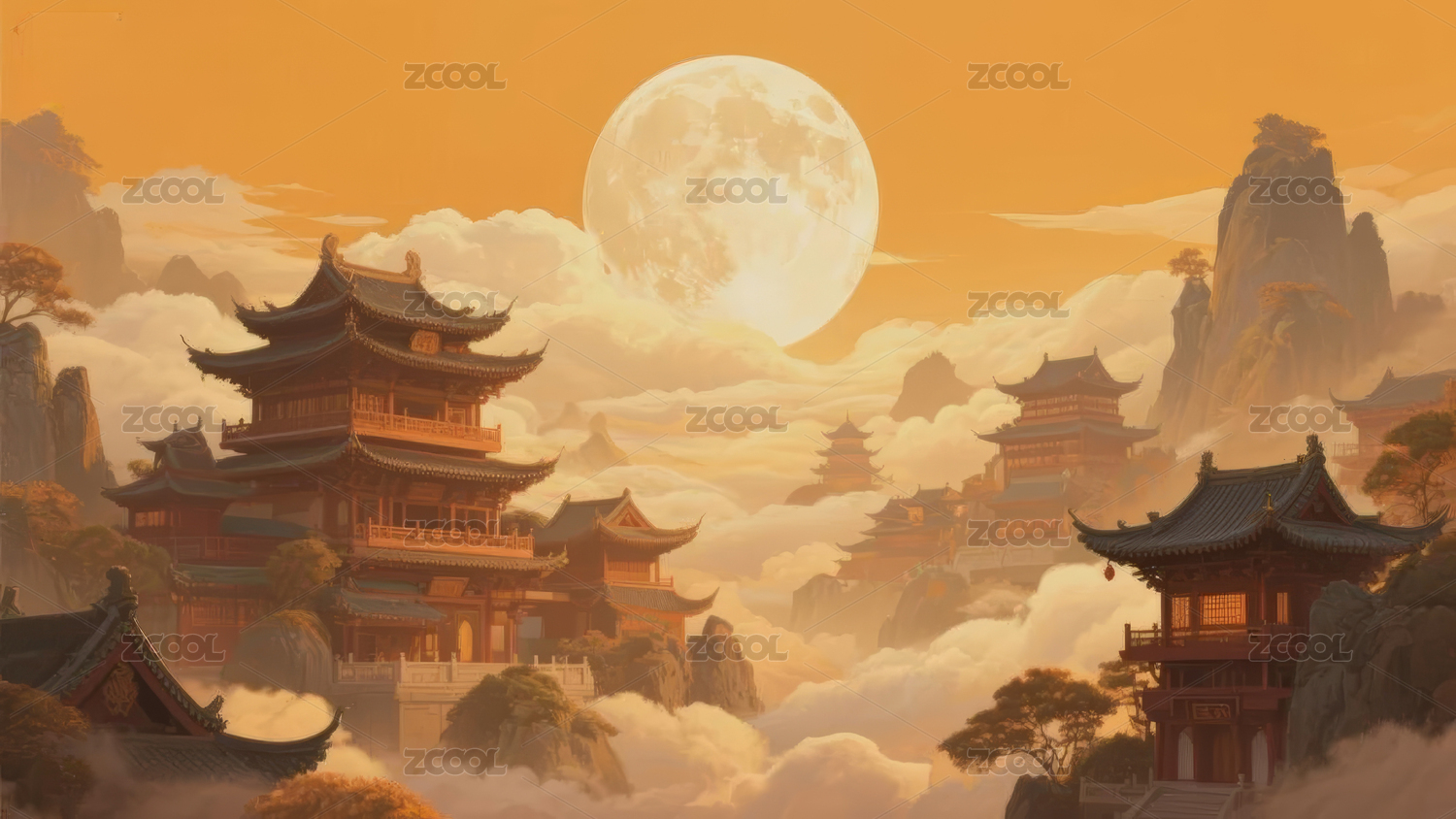 主视觉,场景,国风,插画,夜景,山水,楼阁,明月,祥云,艺术