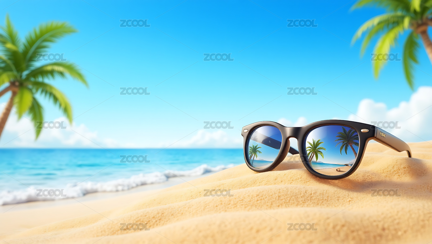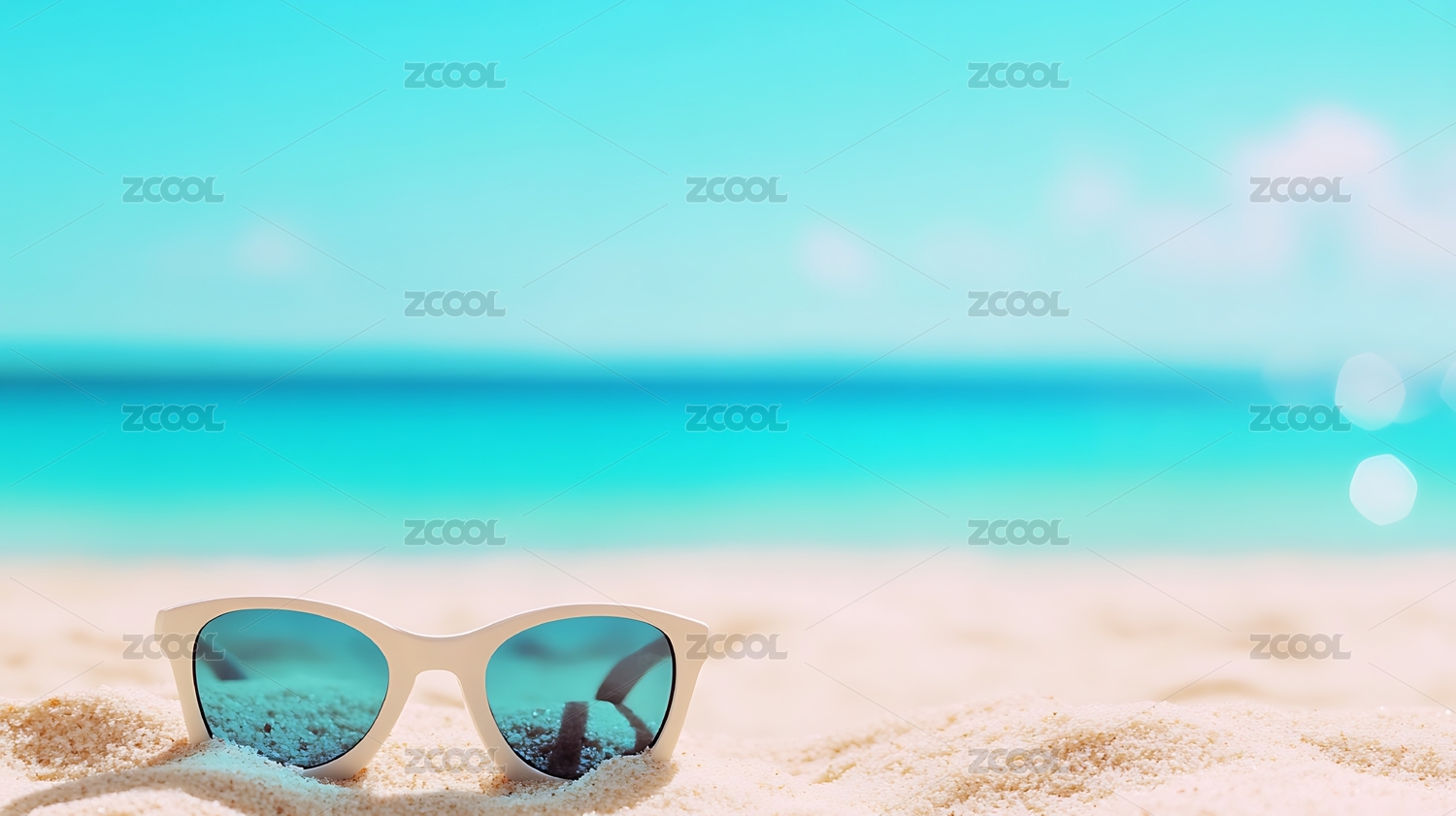 阳光照耀下的海岸沙滩上的太阳眼镜