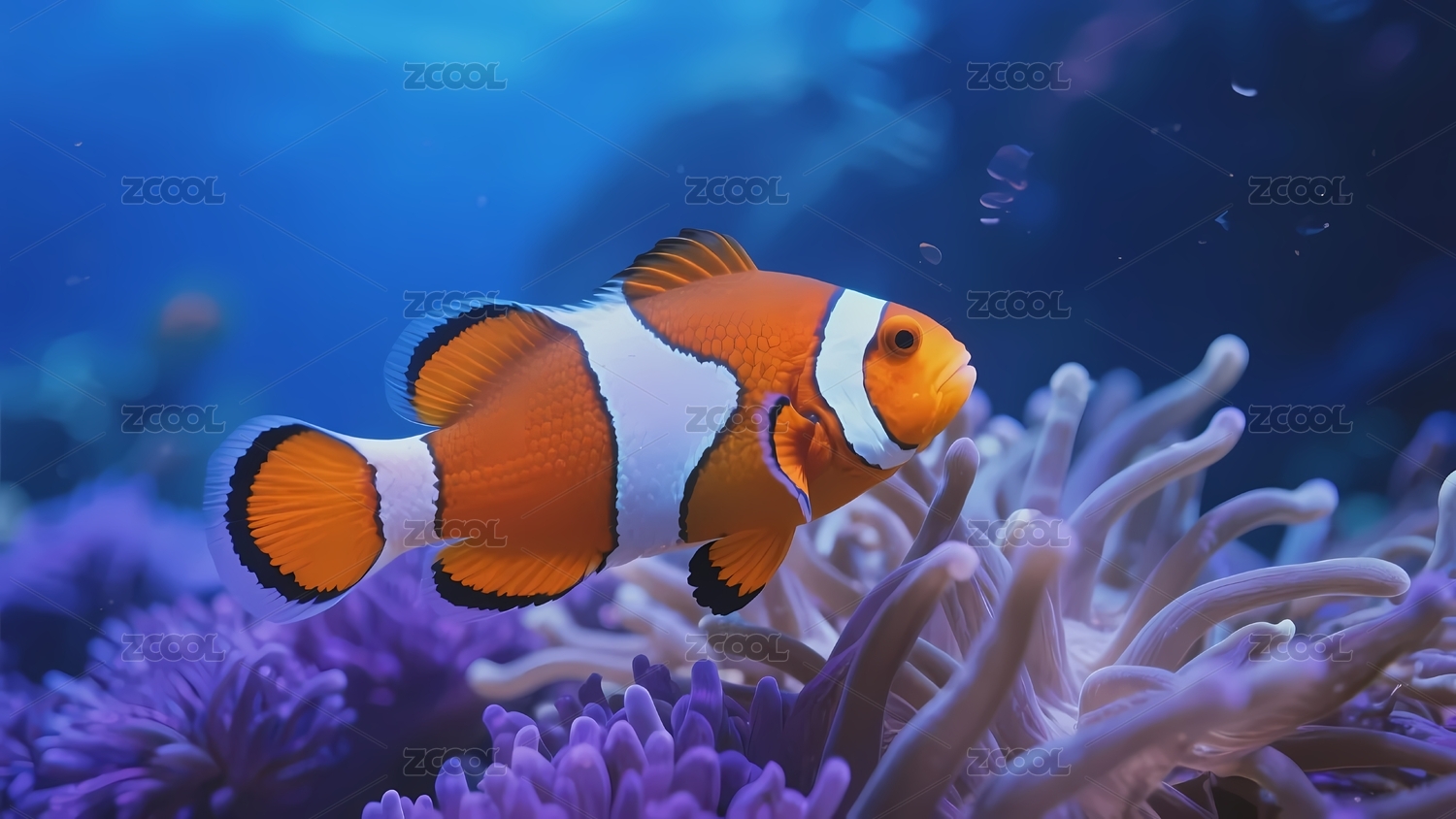 海葵鱼深蓝珊瑚前景紫色