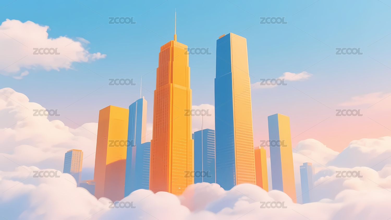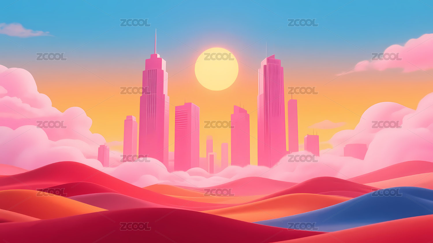 波浪,渐变,梦幻,橙色,蓝色,红色,高楼,粉红,云朵,地面