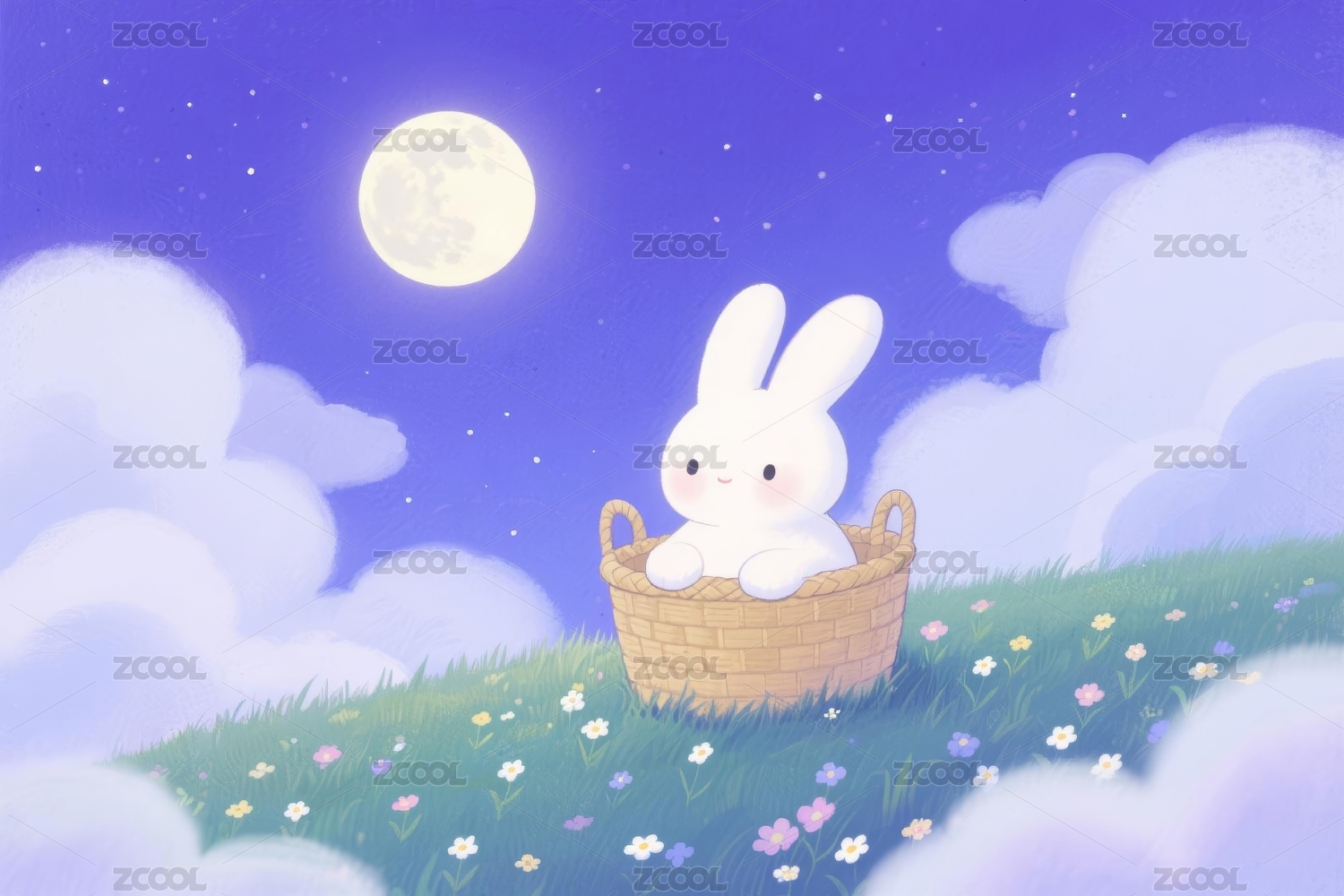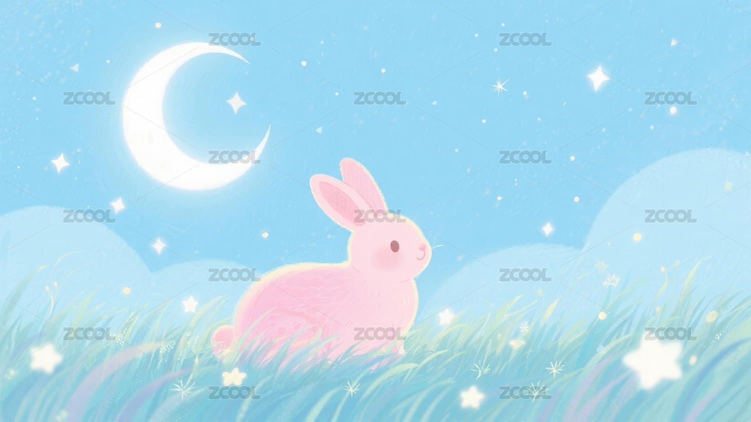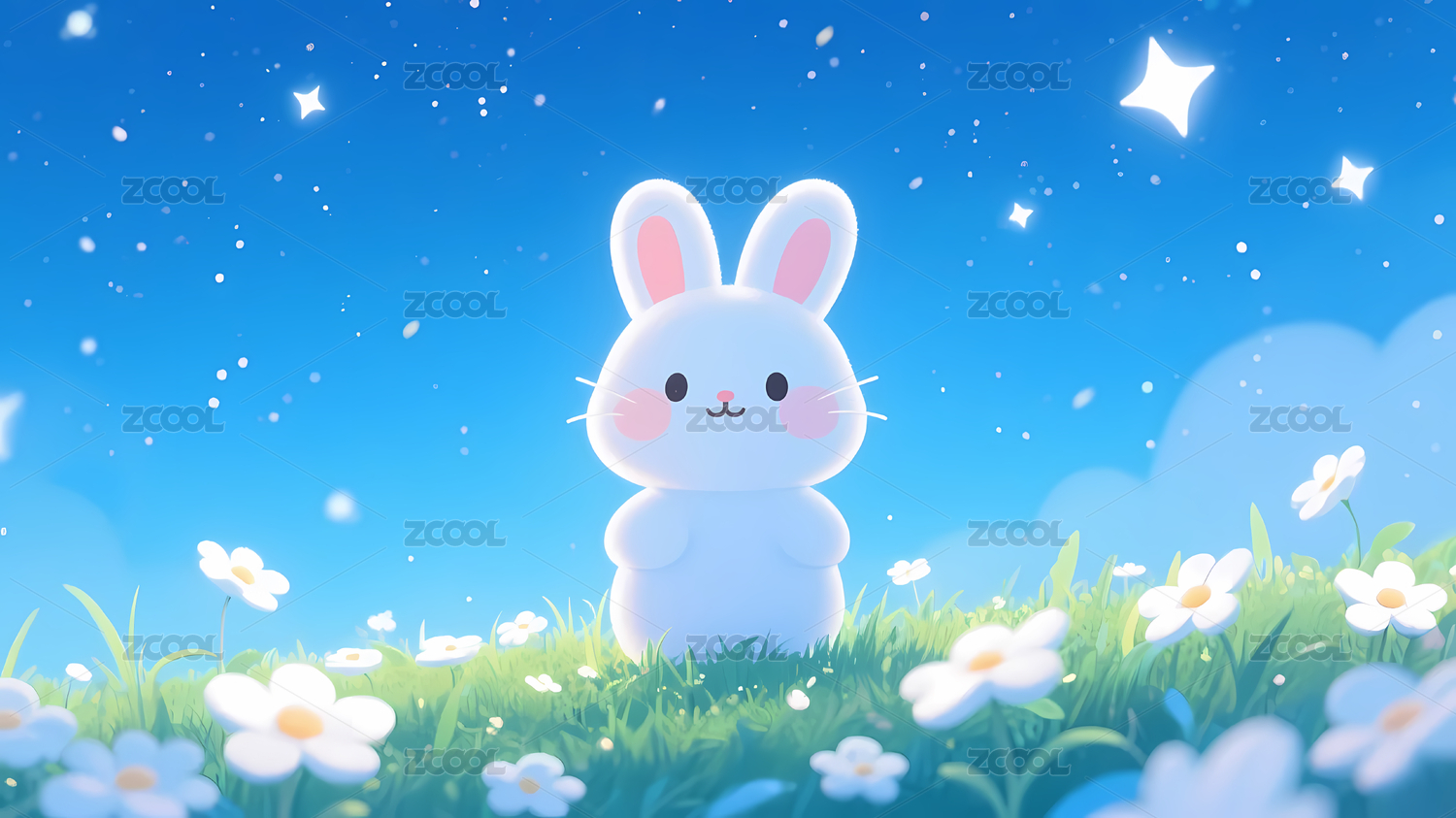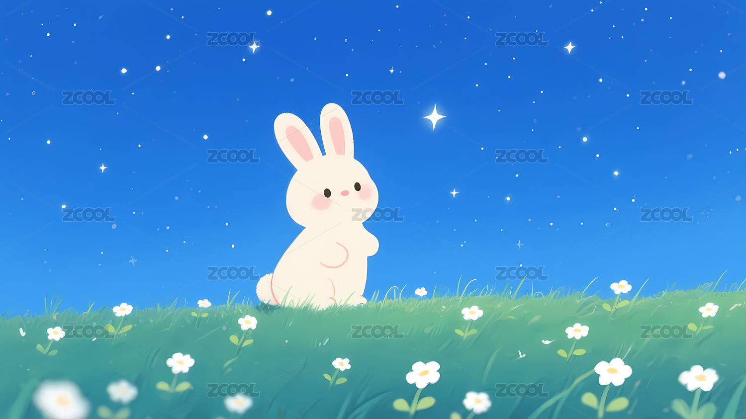 花朵,自然,绿色,梦幻,蓝色,兔子,白色,夜空,星星,草地