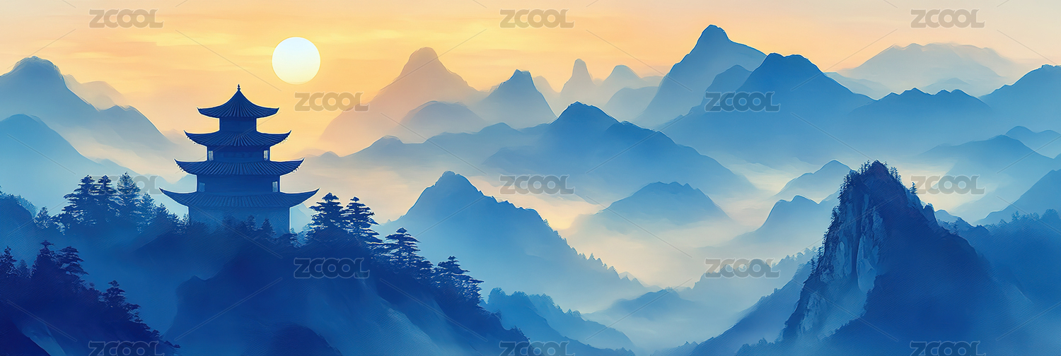 日出山峦中式建筑