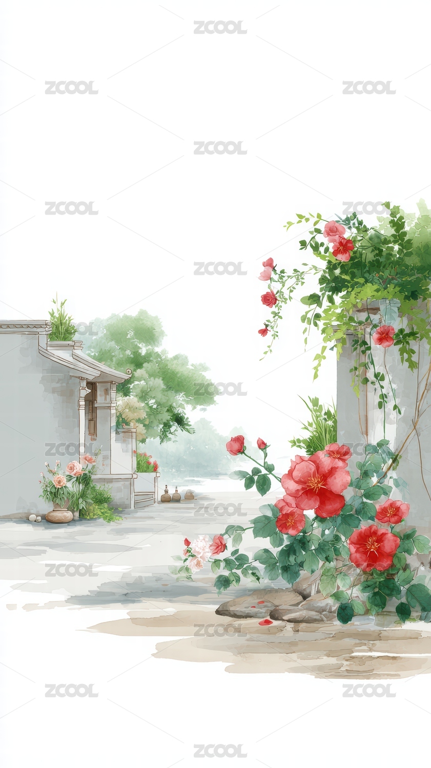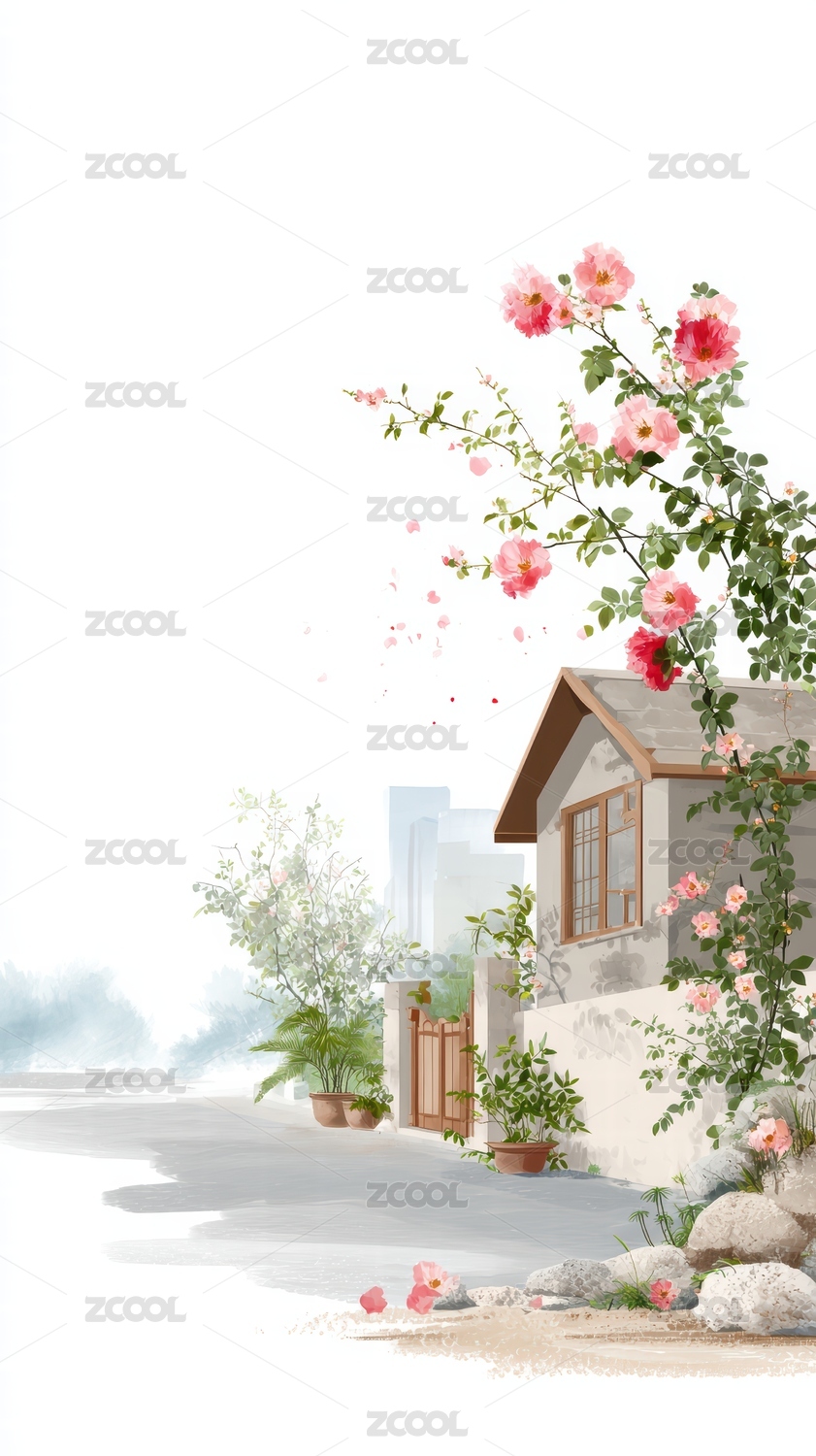 薄雾,小院,桃花,木门,石墙,乡路,绿树,幽静