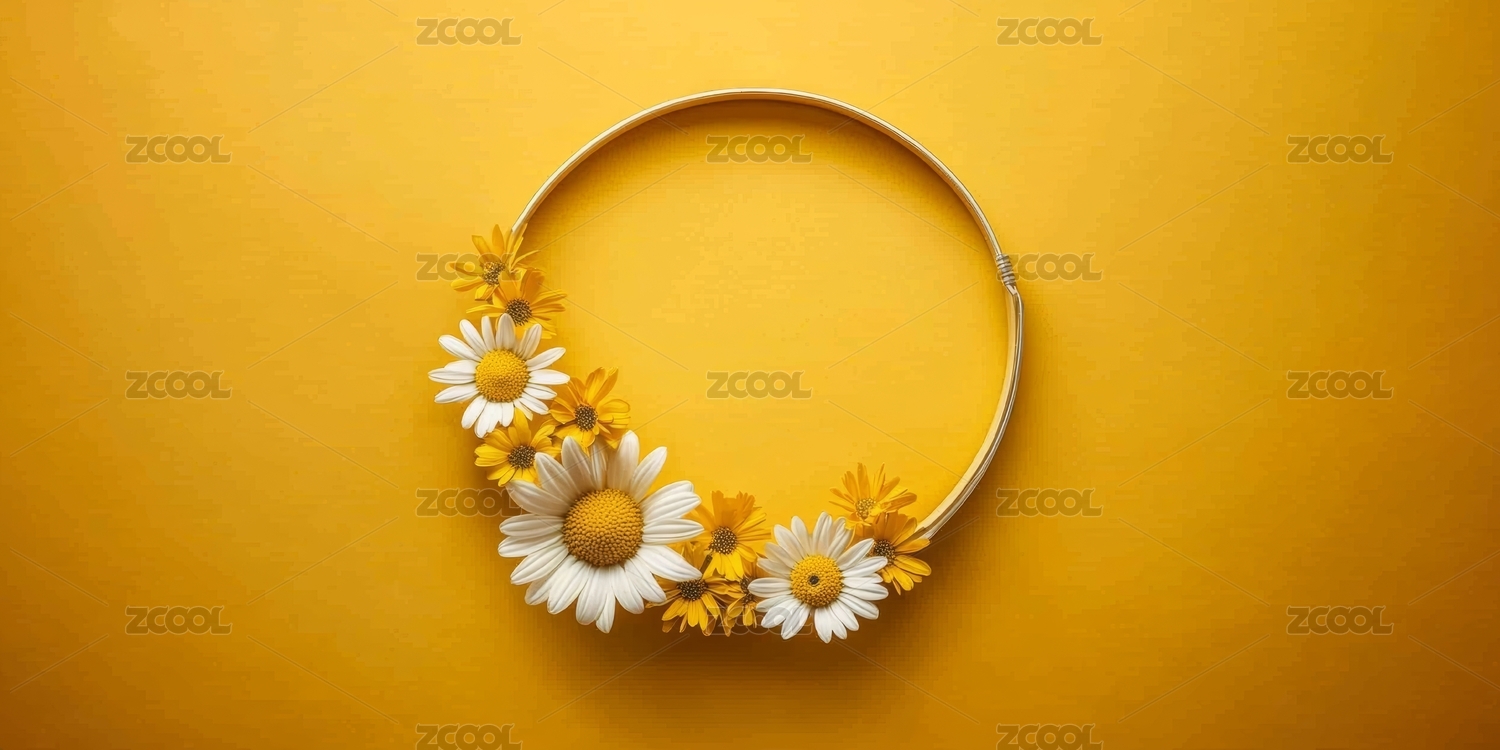 雏菊围绕白色圆环的黄色背景图