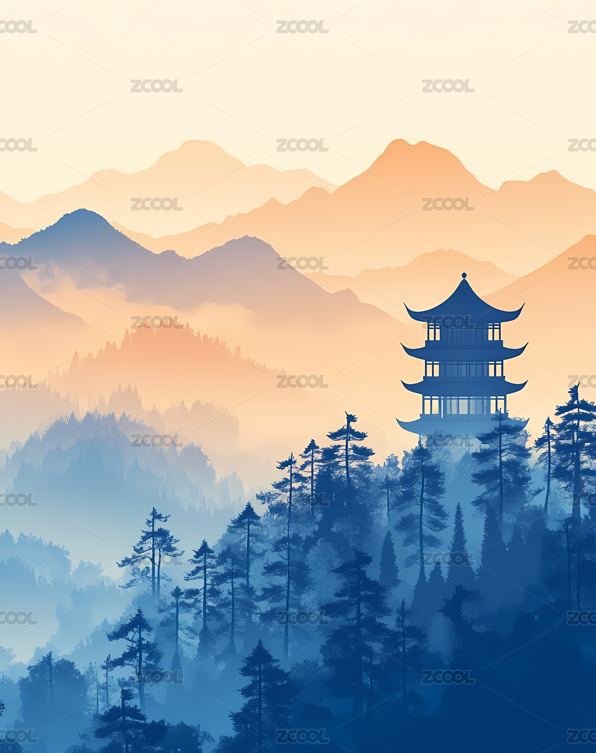 山水,古塔,松林,山峦,黄昏,建筑,森林,远景