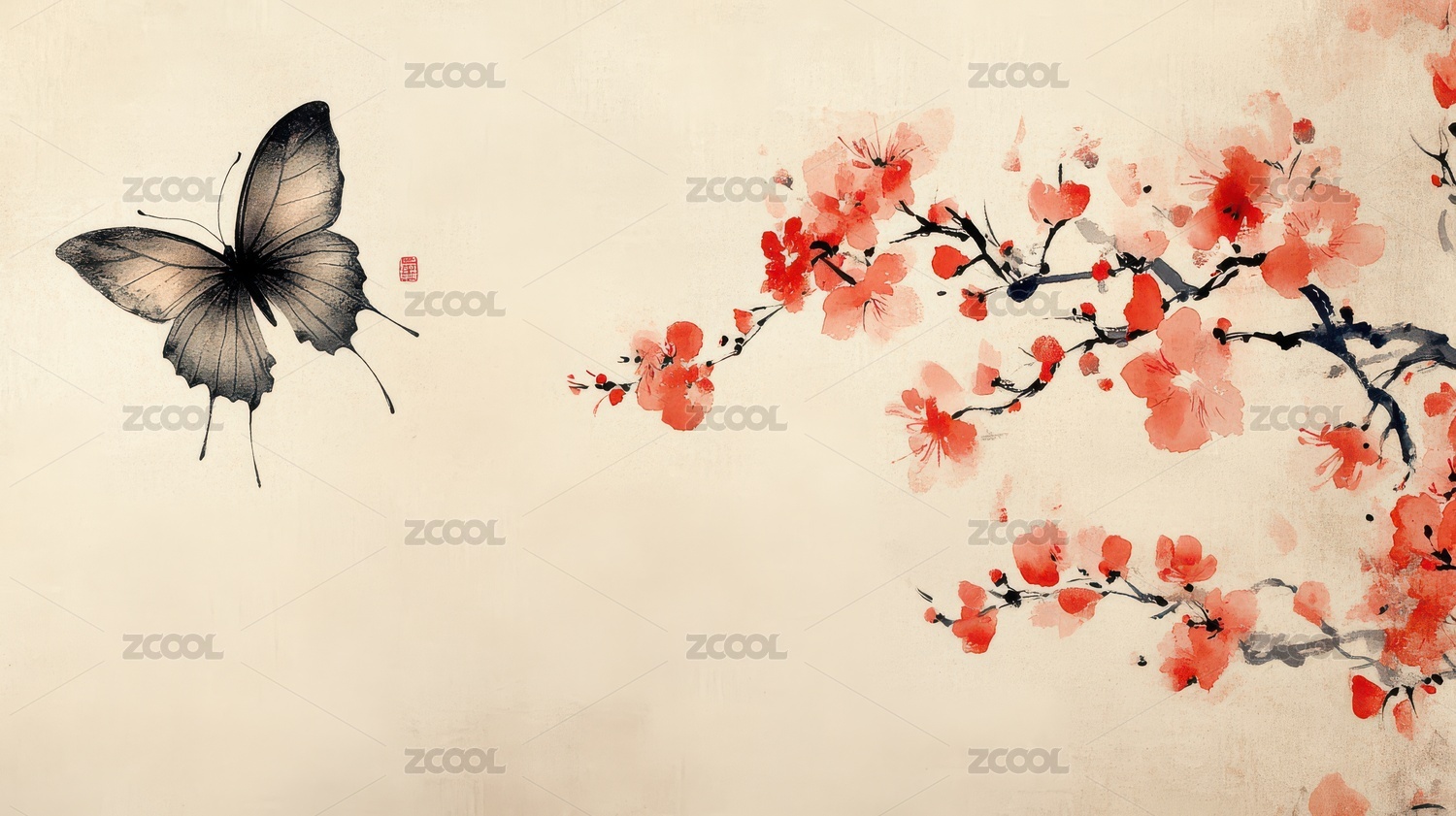 水墨蝴蝶与淡雅花卉
