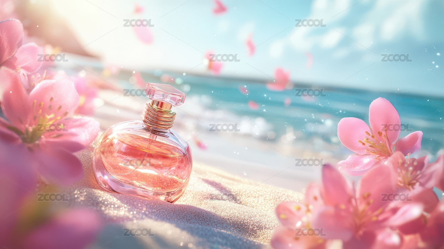 粉色香水与花瓣的梦幻海滩