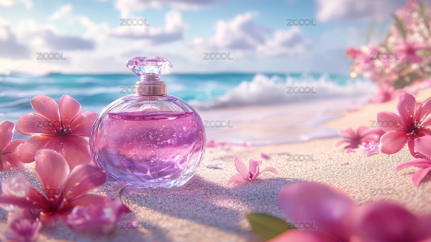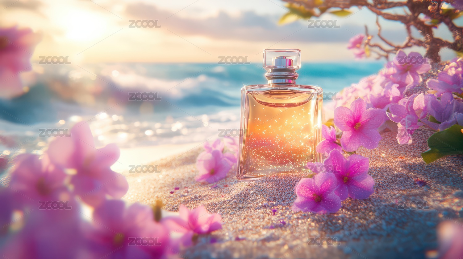 紫色香水与粉色花朵的海滩美景