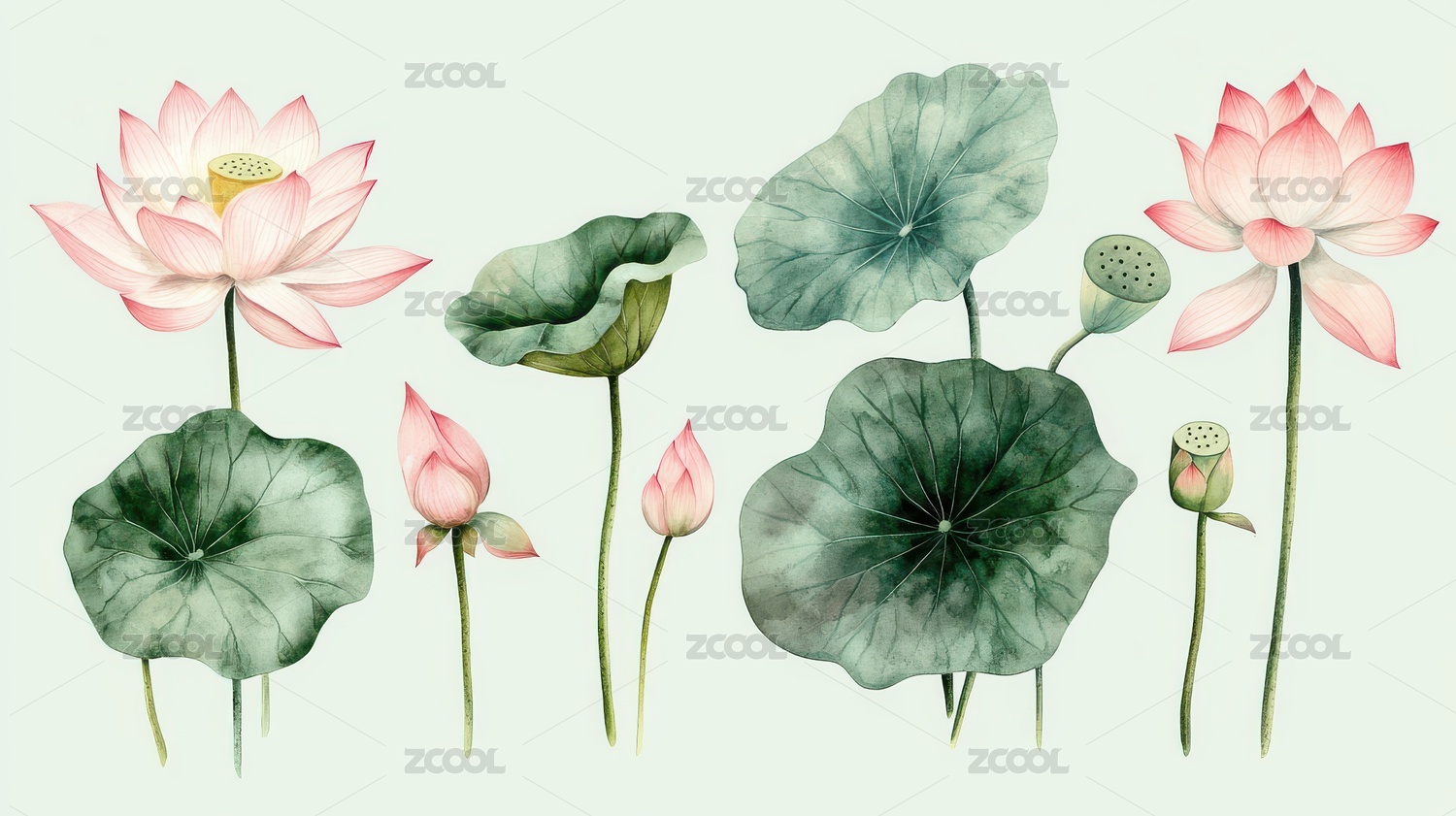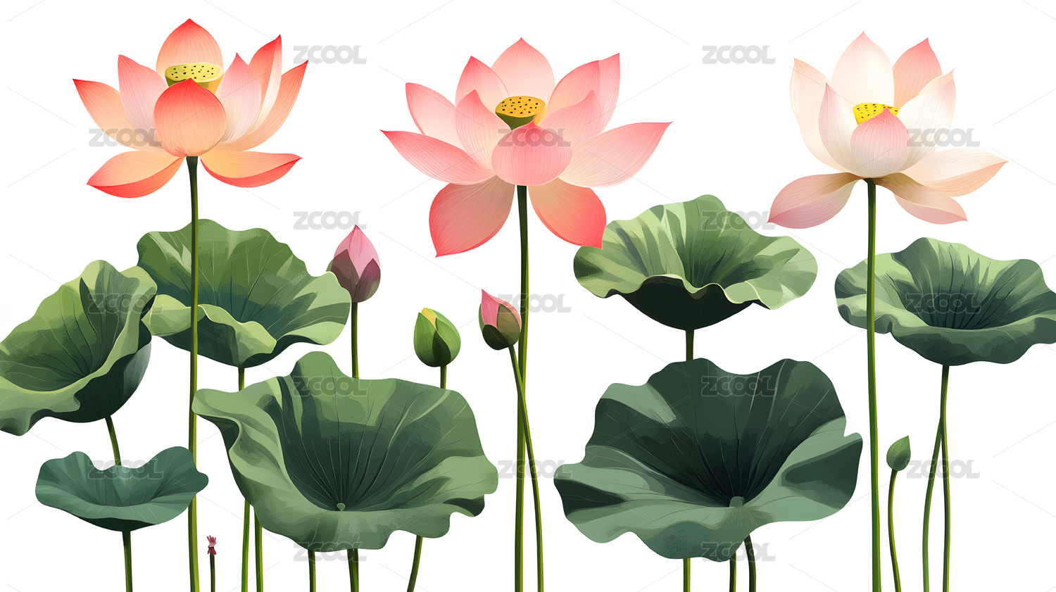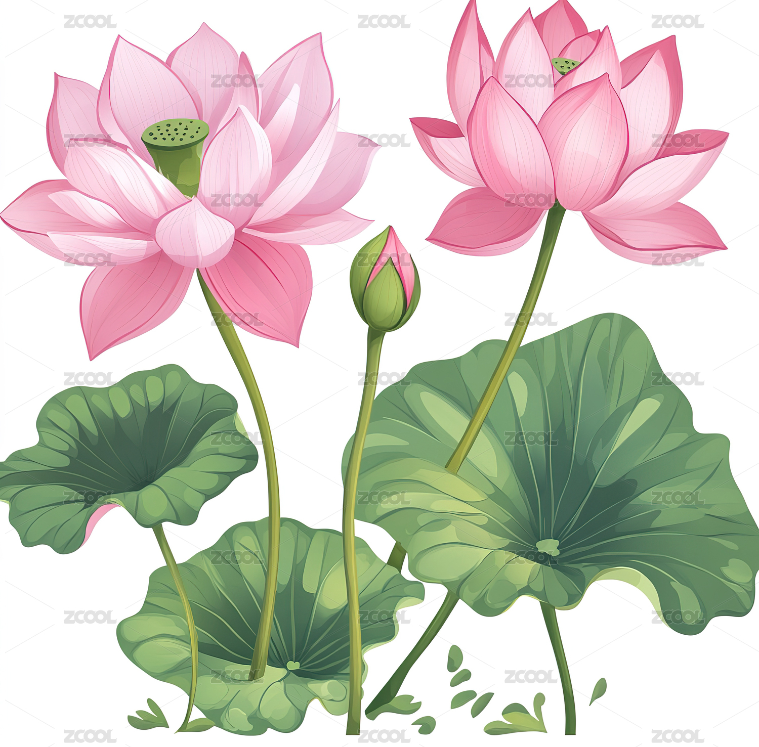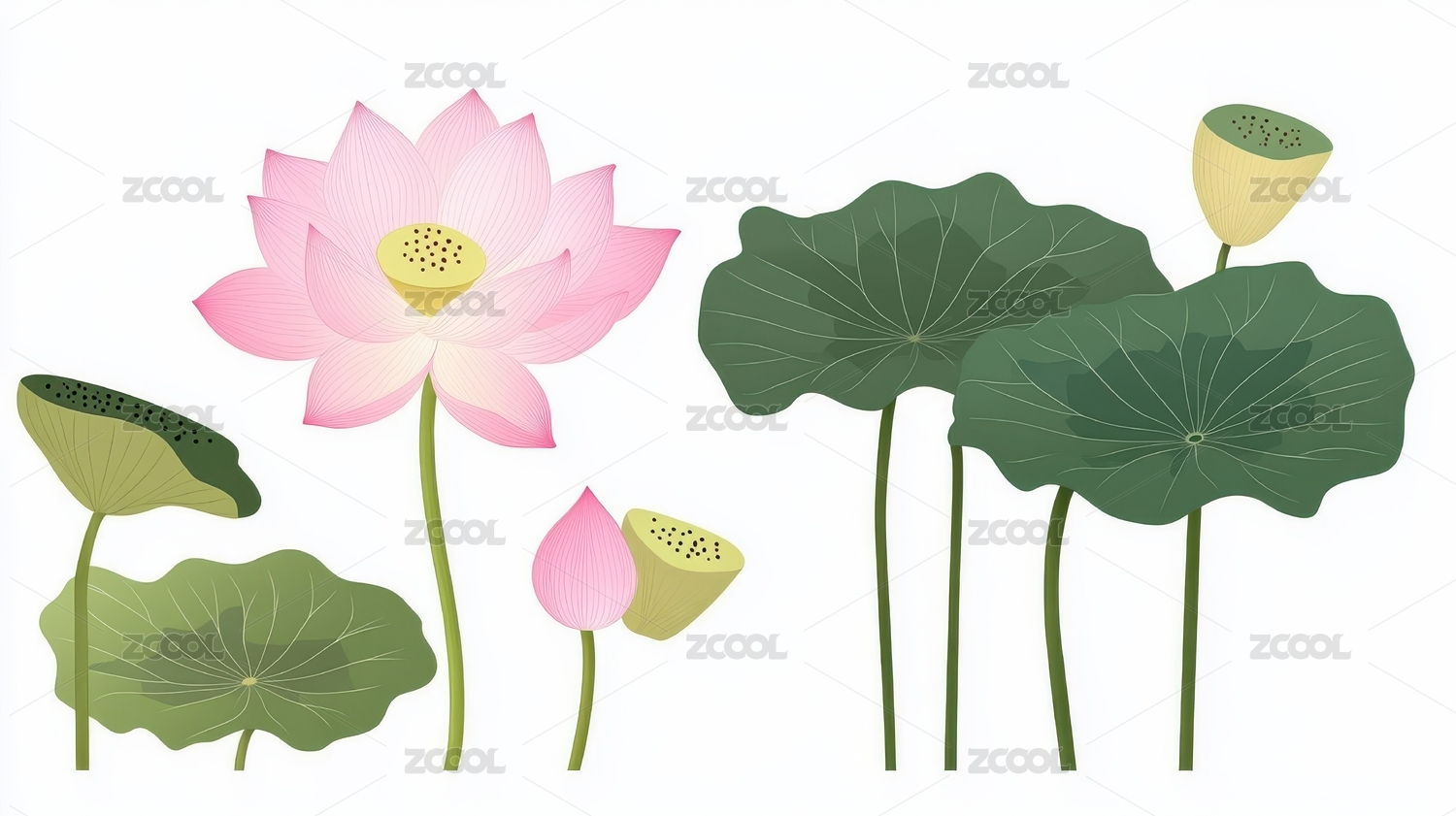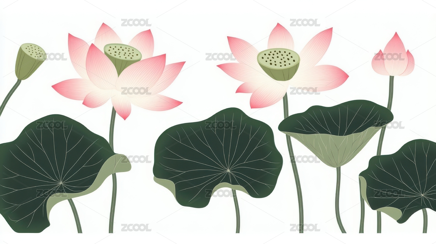 莲花,莲叶,花蕊,绿色,粉色,植物,自然,插画,简洁,艺术