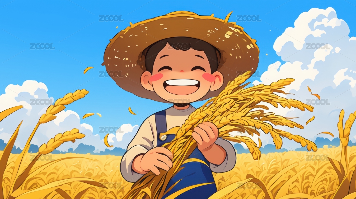 丰收时期戴着草帽手捧麦子微笑的男孩农夫