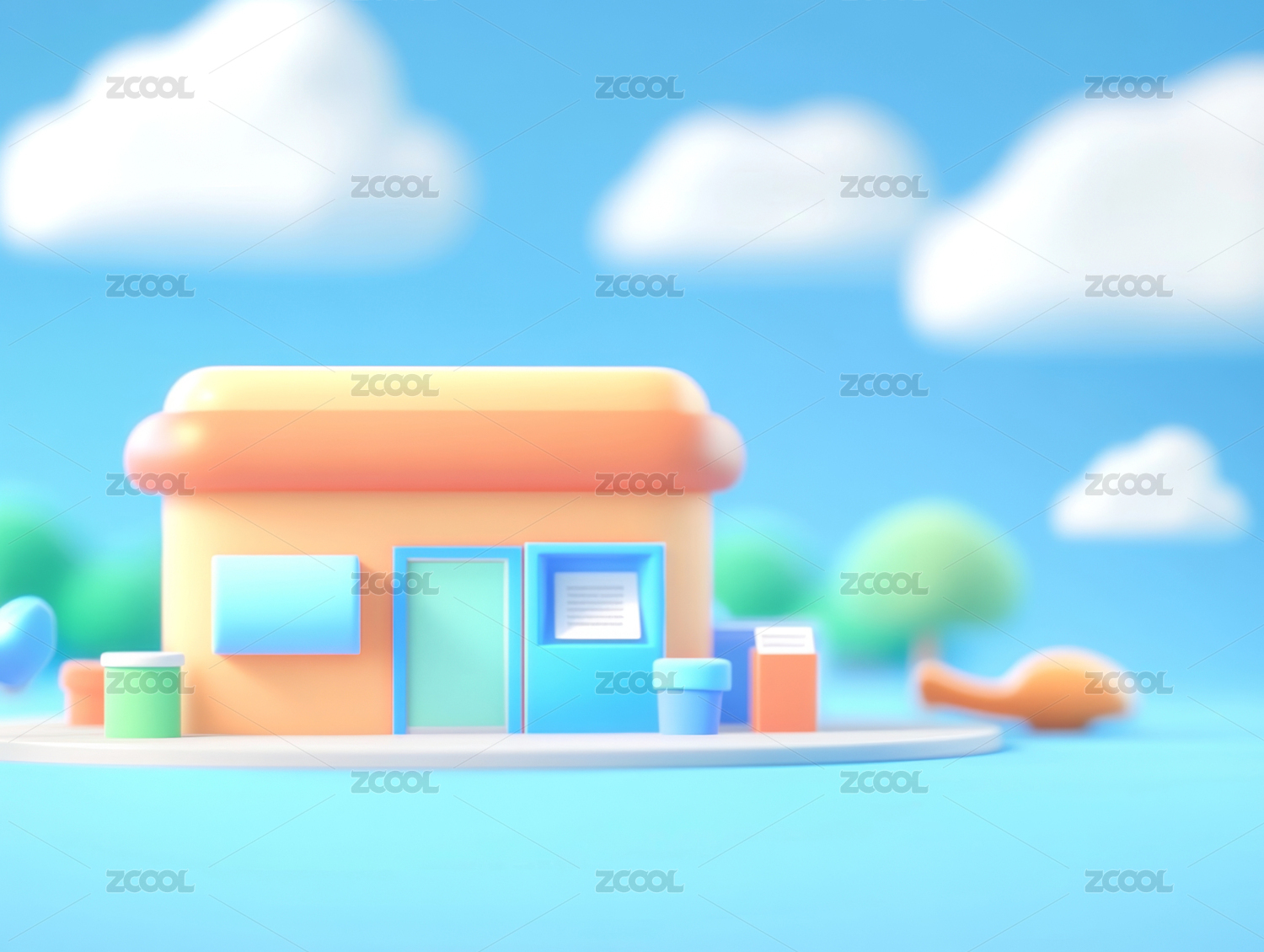 卡通,商店,建筑,树木,云朵,色彩,简洁,背景,天空