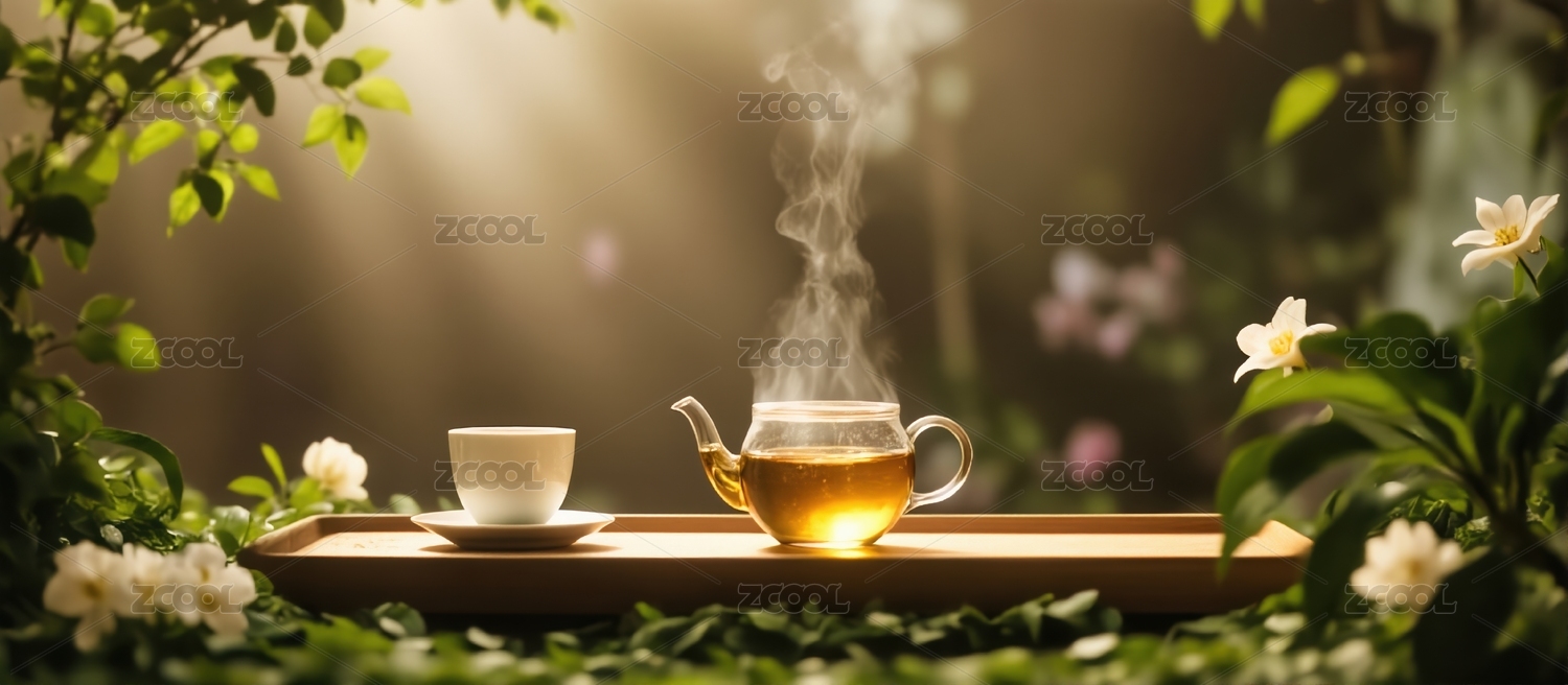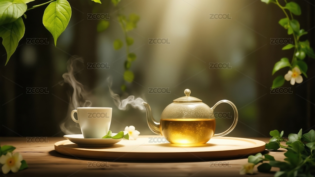 茶壶,茶杯,烟雾,桌面,绿叶,白花,木盘,光线,自然,宁静