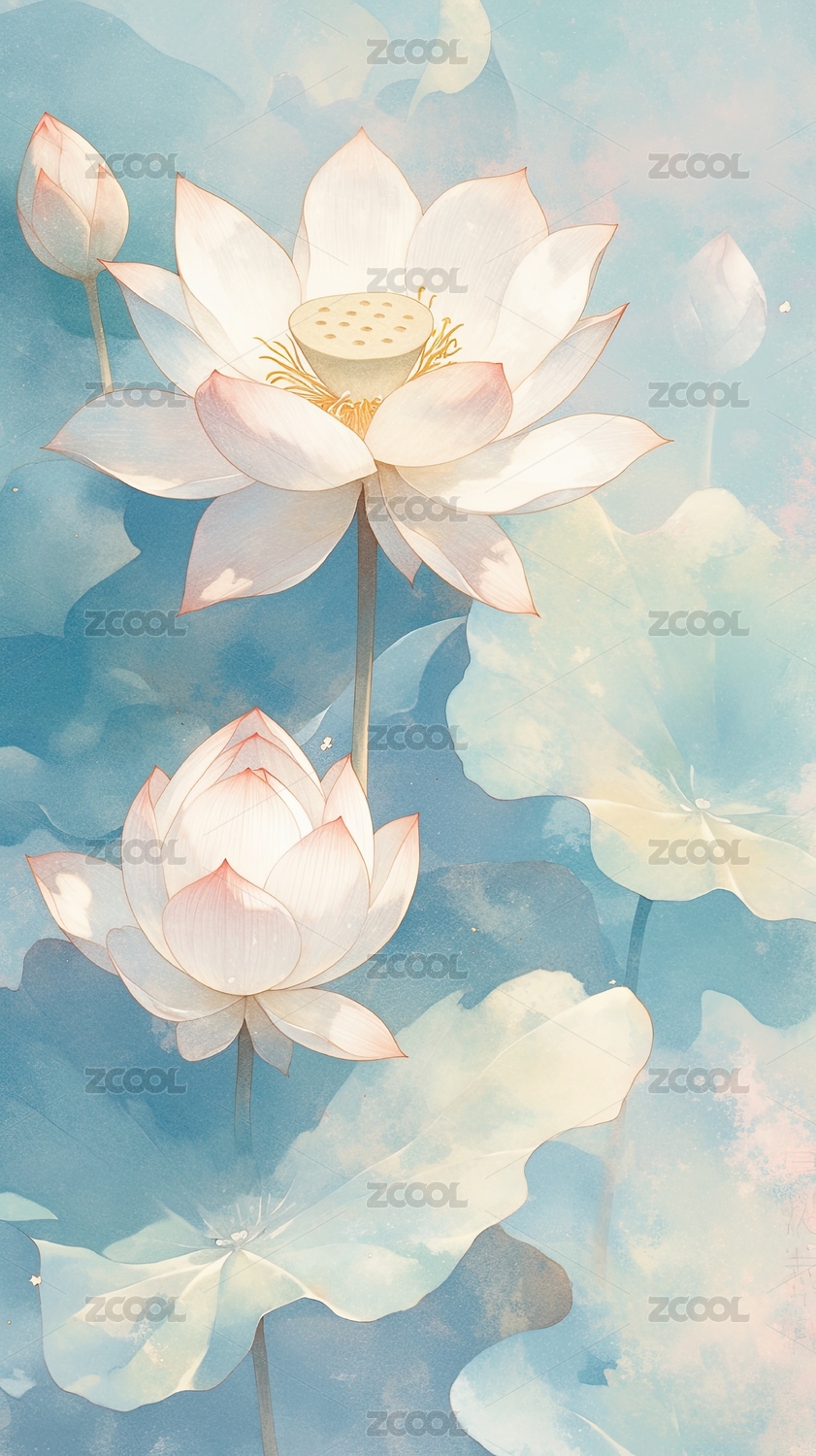 蓝白色荷花插画海报