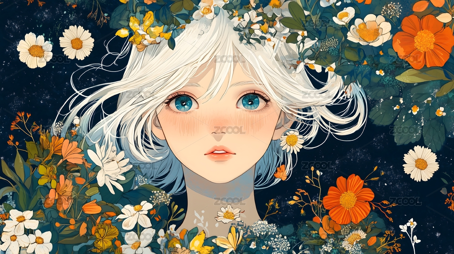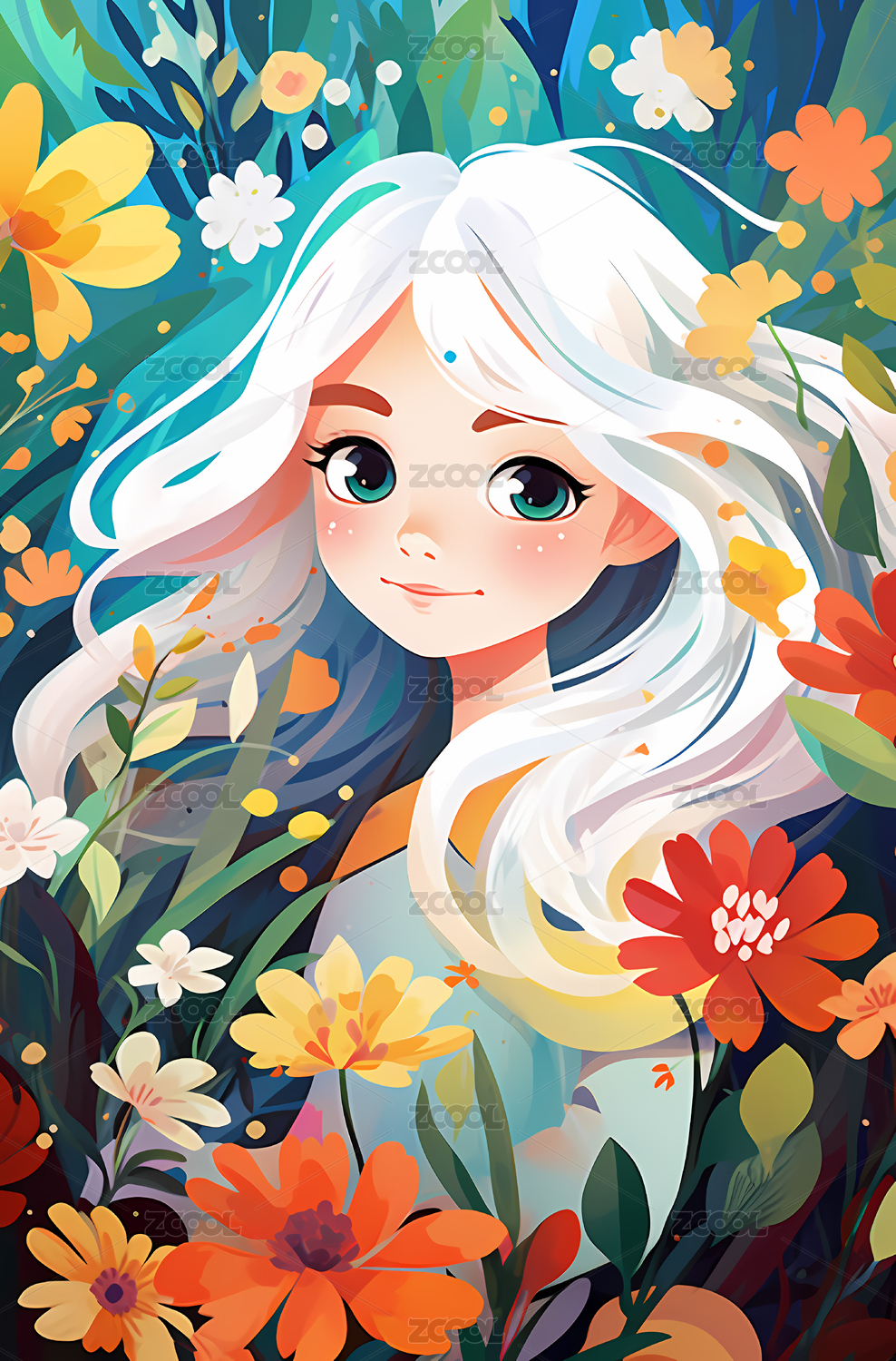 儿童插画可爱的小孩在花丛中闭着眼睛睡觉