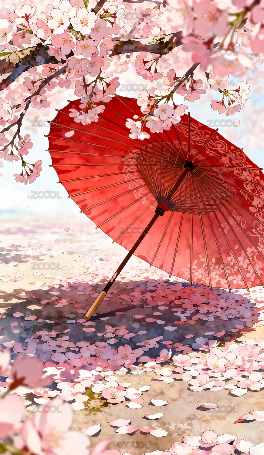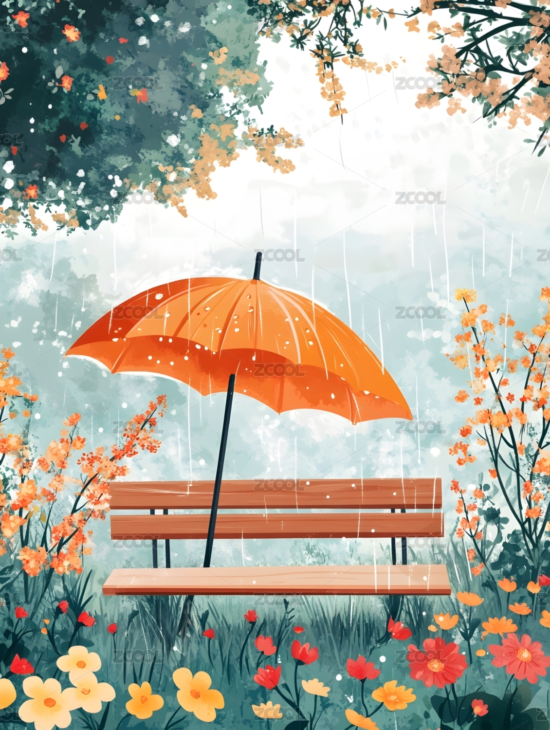 春雨,红伞,繁花,绿坪,雨滴,湿润,朦胧,清新,静谧,诗意