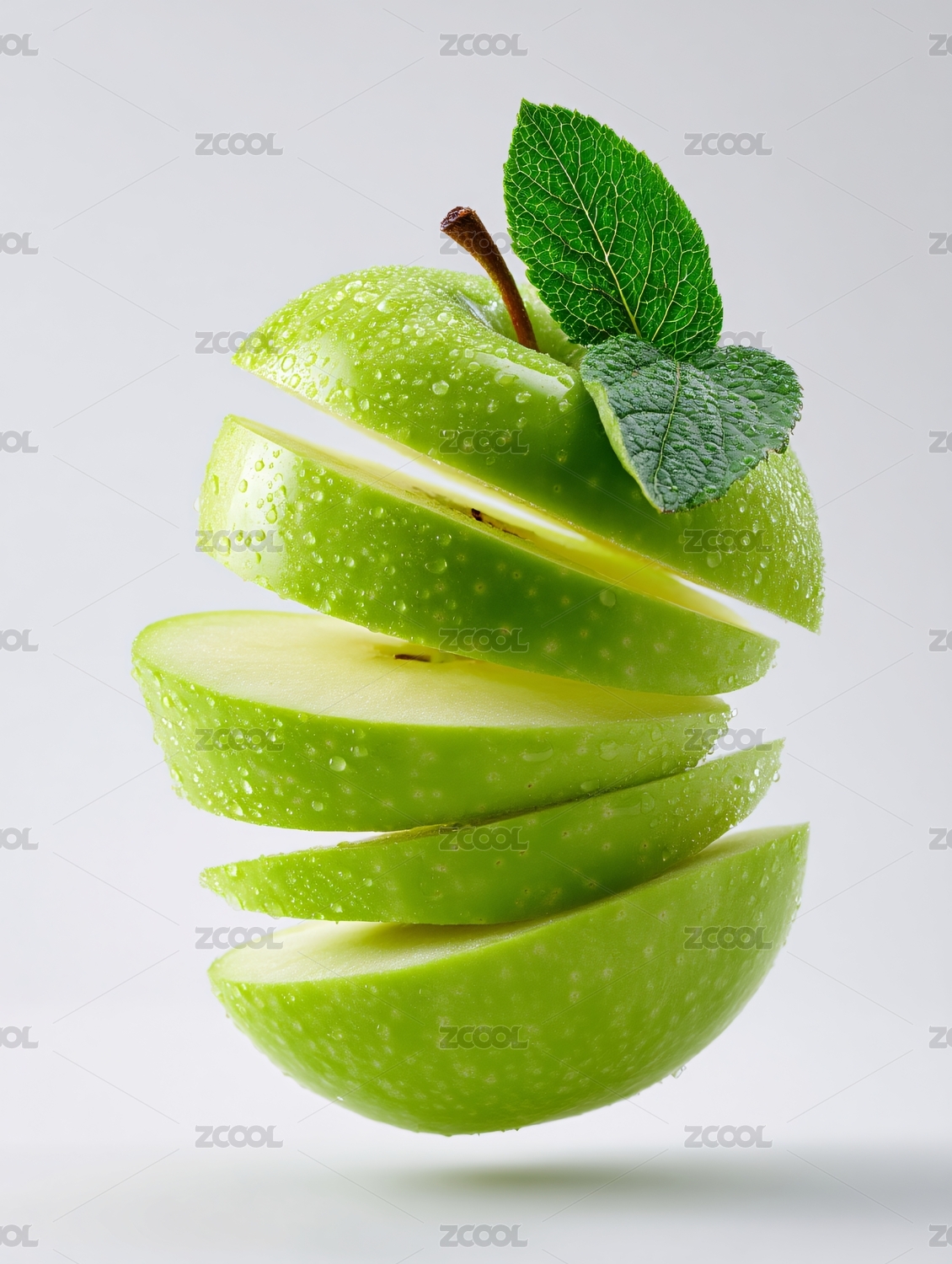 青苹果,切片,水花,翠绿,清爽,鲜润,水滴,动感,果香,脆嫩