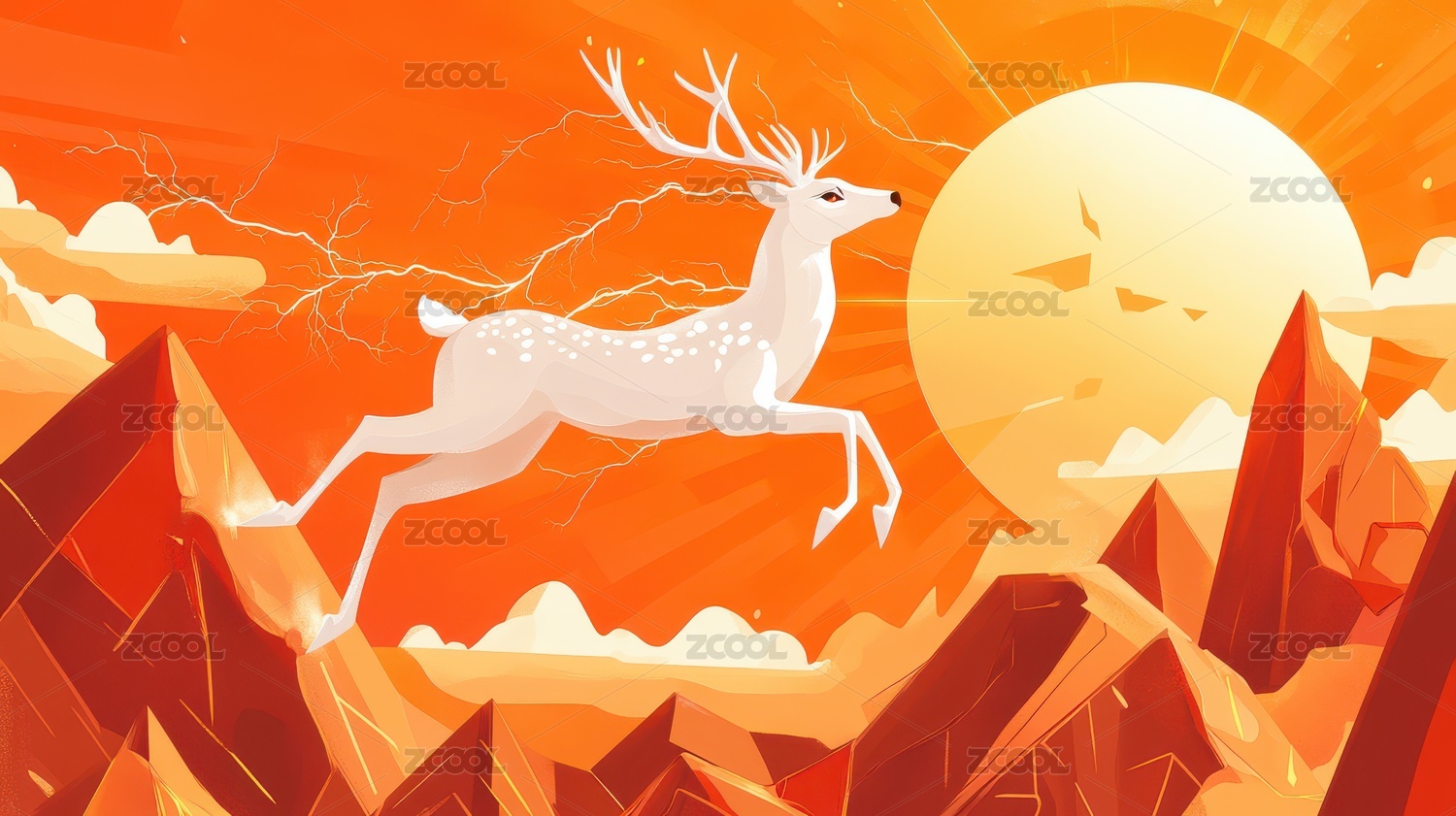 自然,山峰,雪山,日落,岩石,夕阳,云彩,鹿角,动物,植被