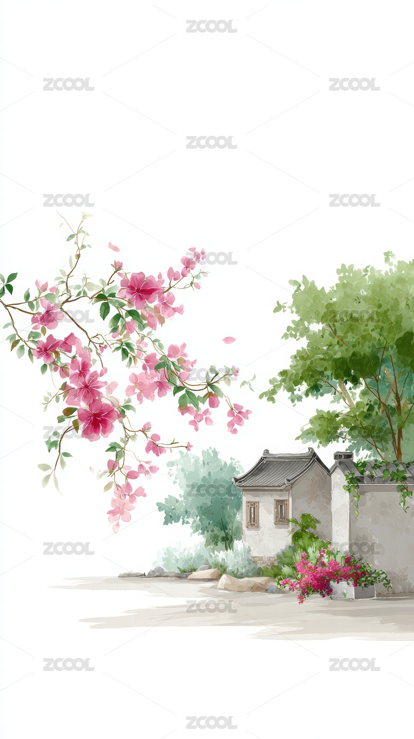 水彩风格江南乡村古镇