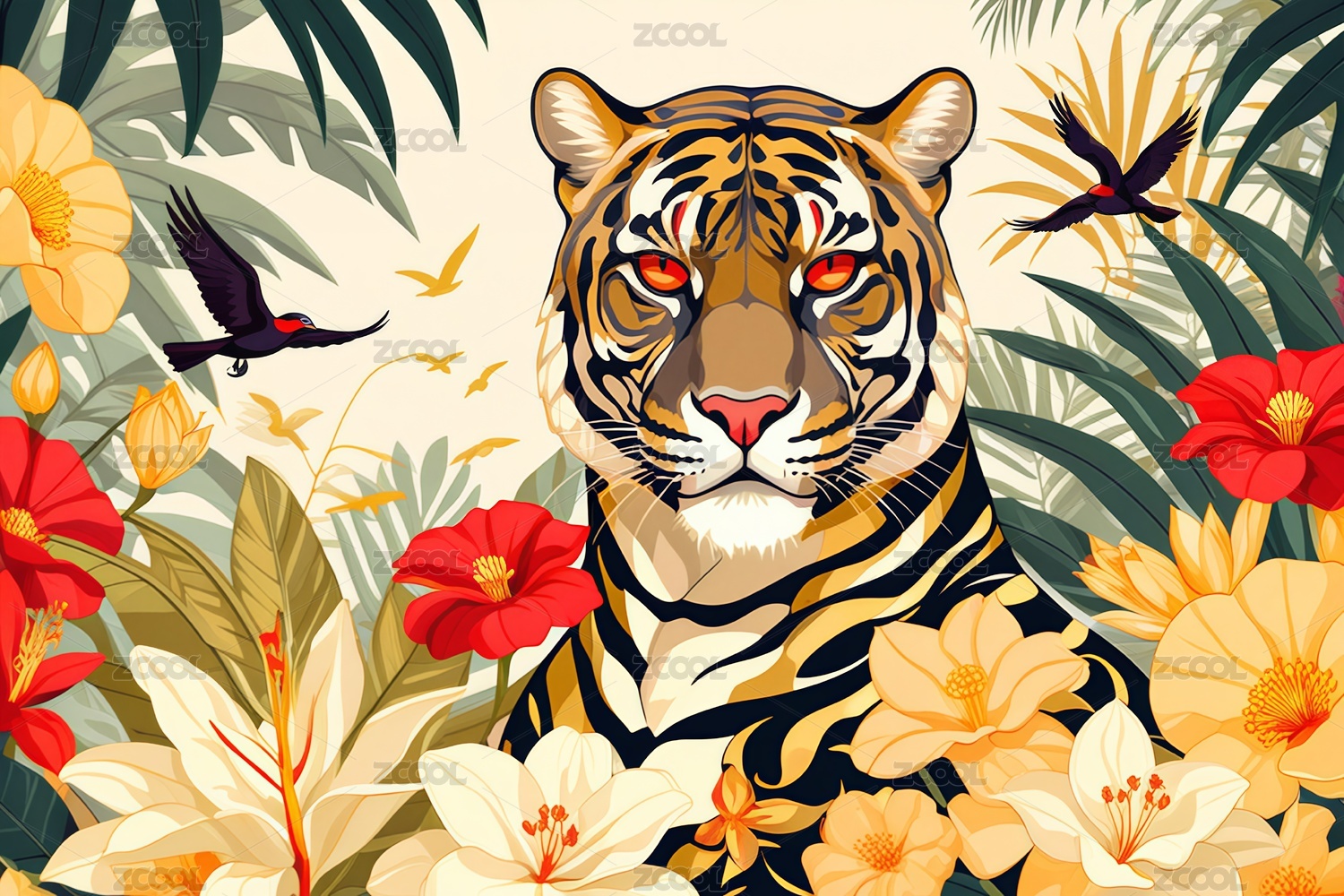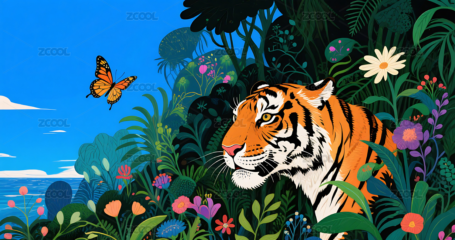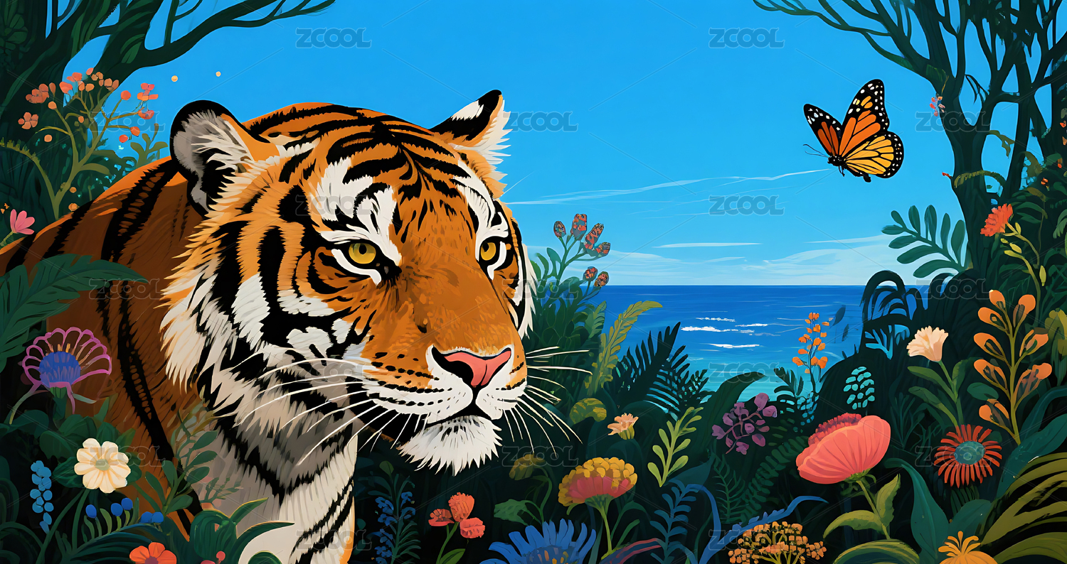 老虎,插画,背景壁纸,植物,时尚,复古,艺术