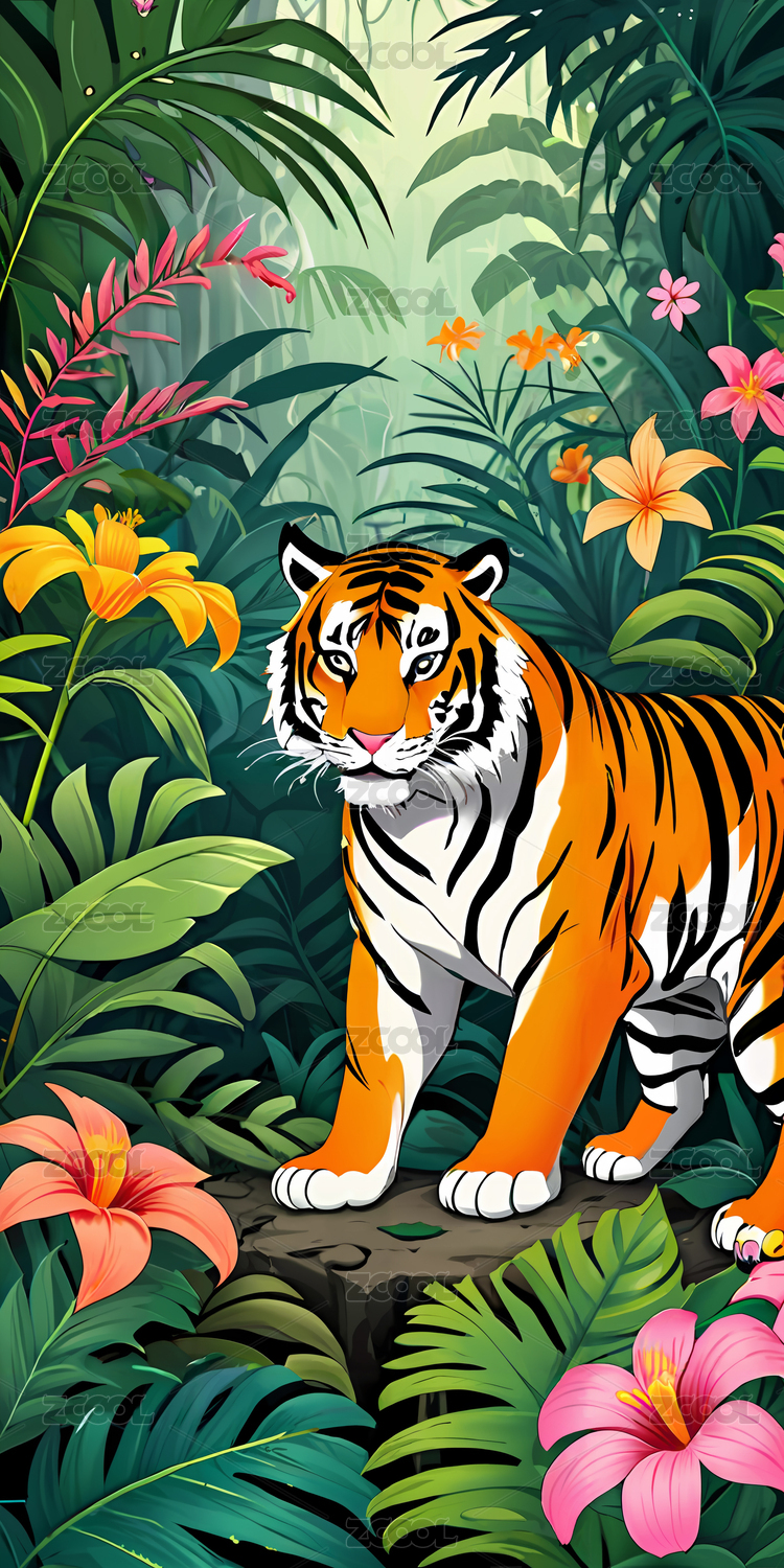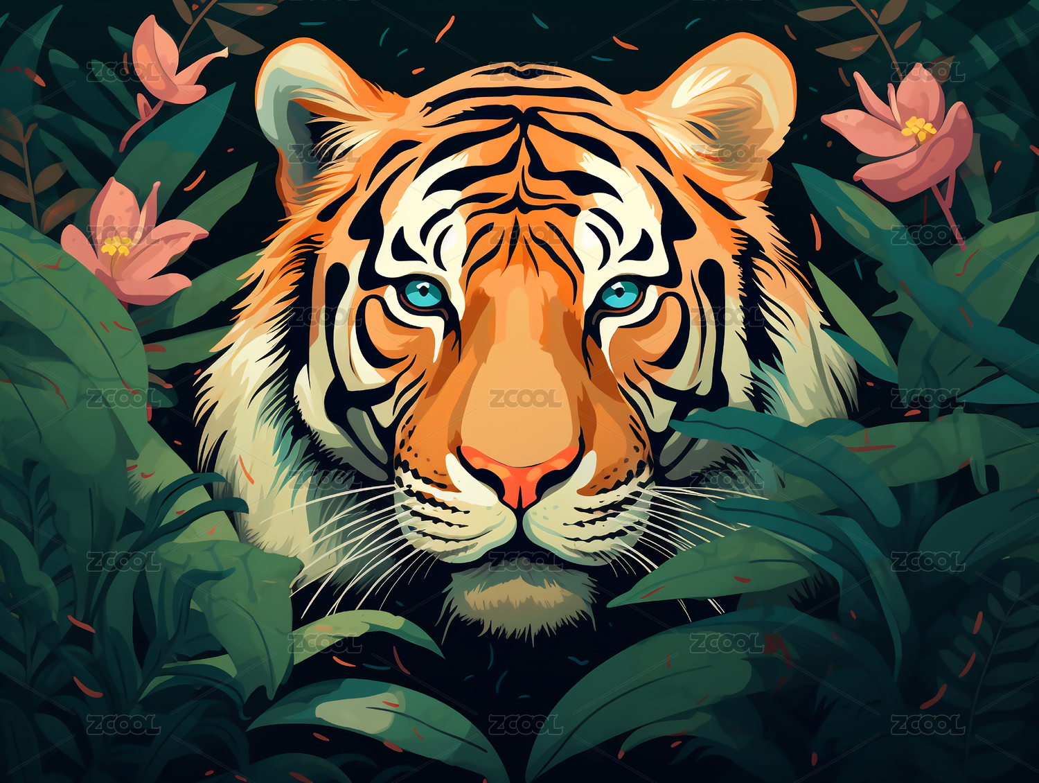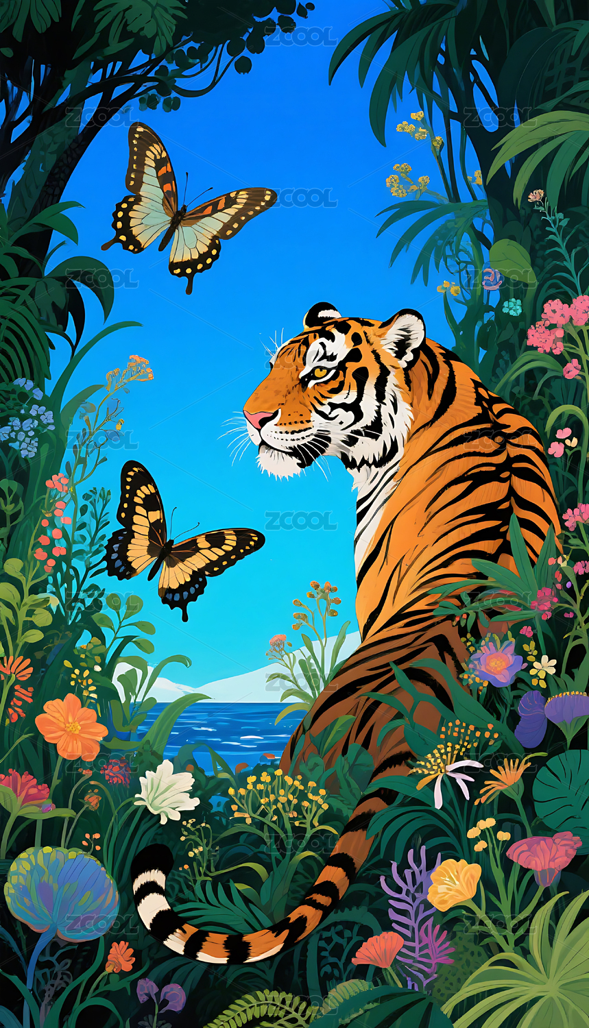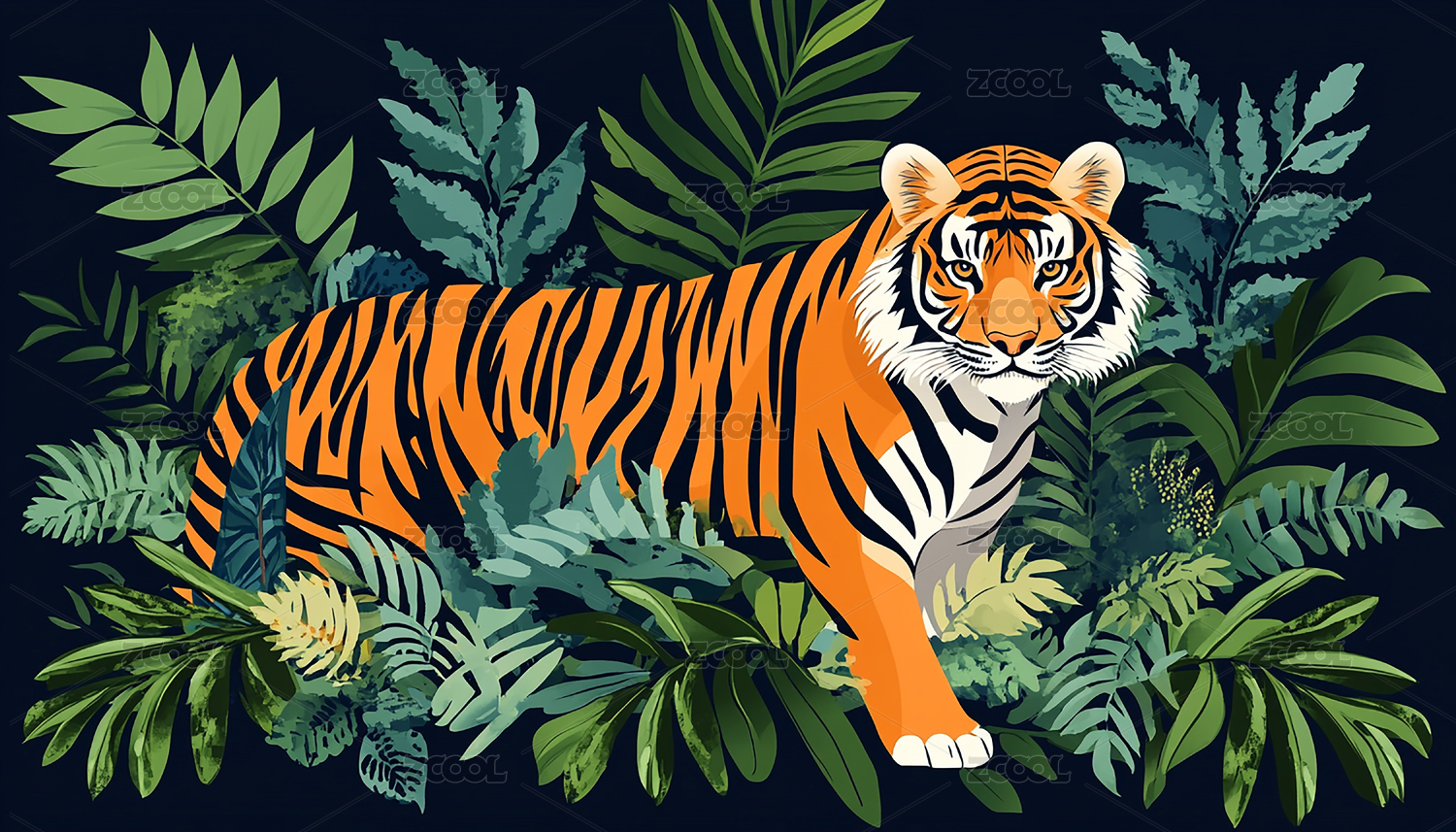 老虎,插画,背景壁纸,植物,时尚,复古,艺术