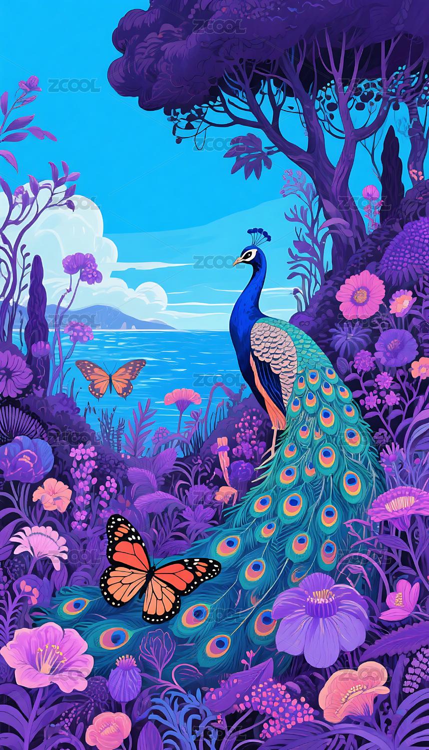 时尚,复古,插画,背景,壁纸,植物,动物,豹子
