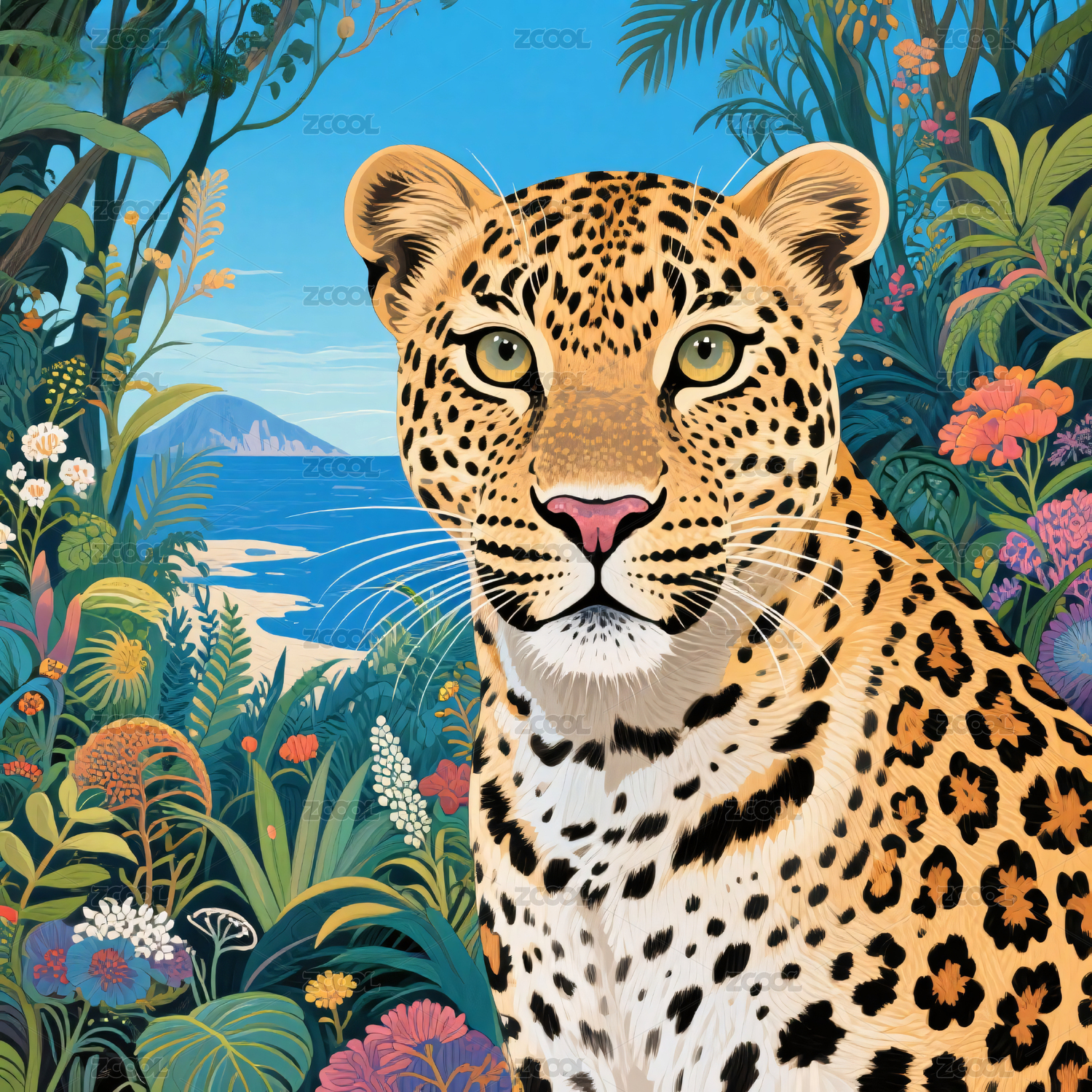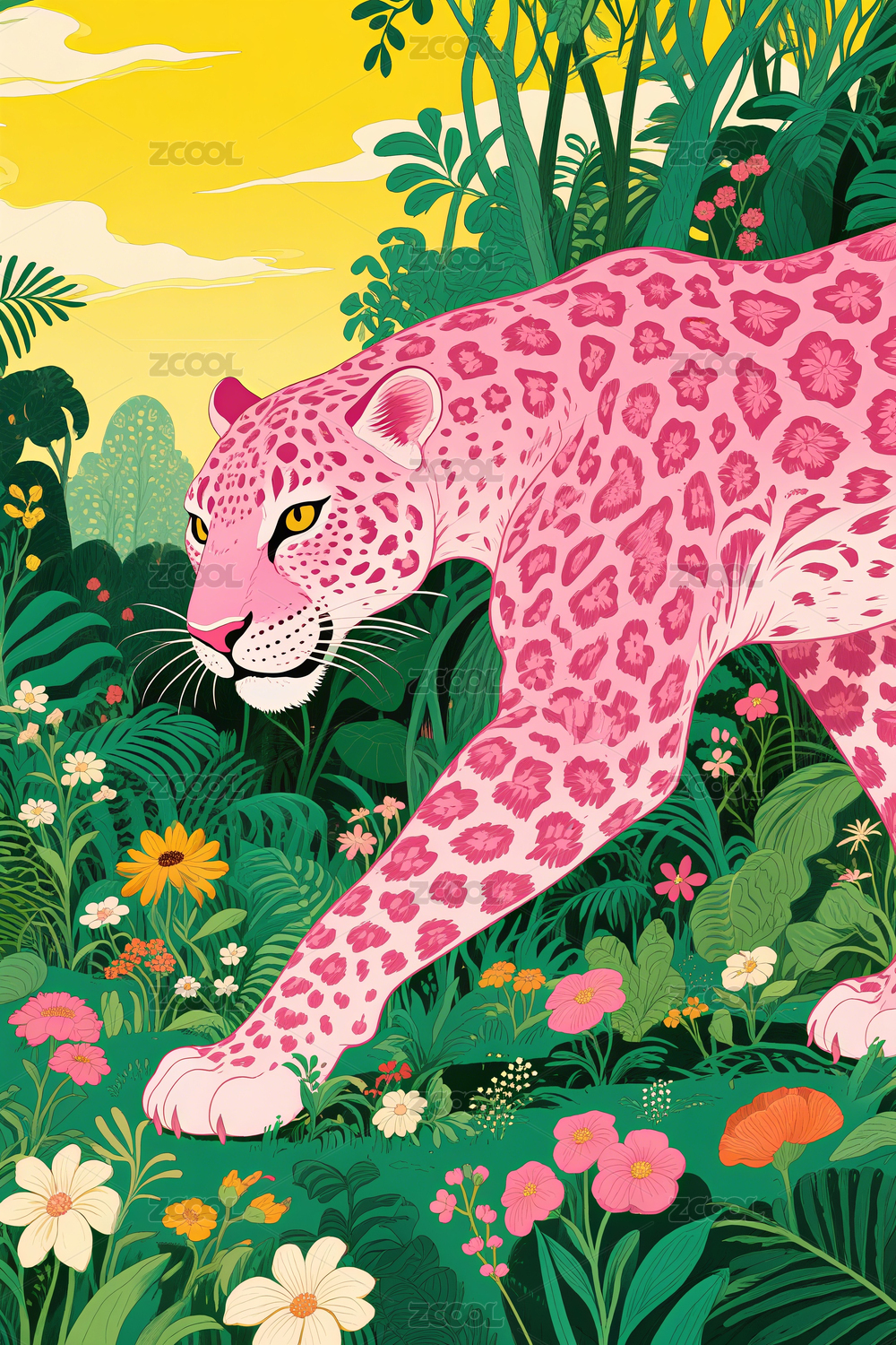 时尚,复古,插画,背景,壁纸,植物,动物,豹子