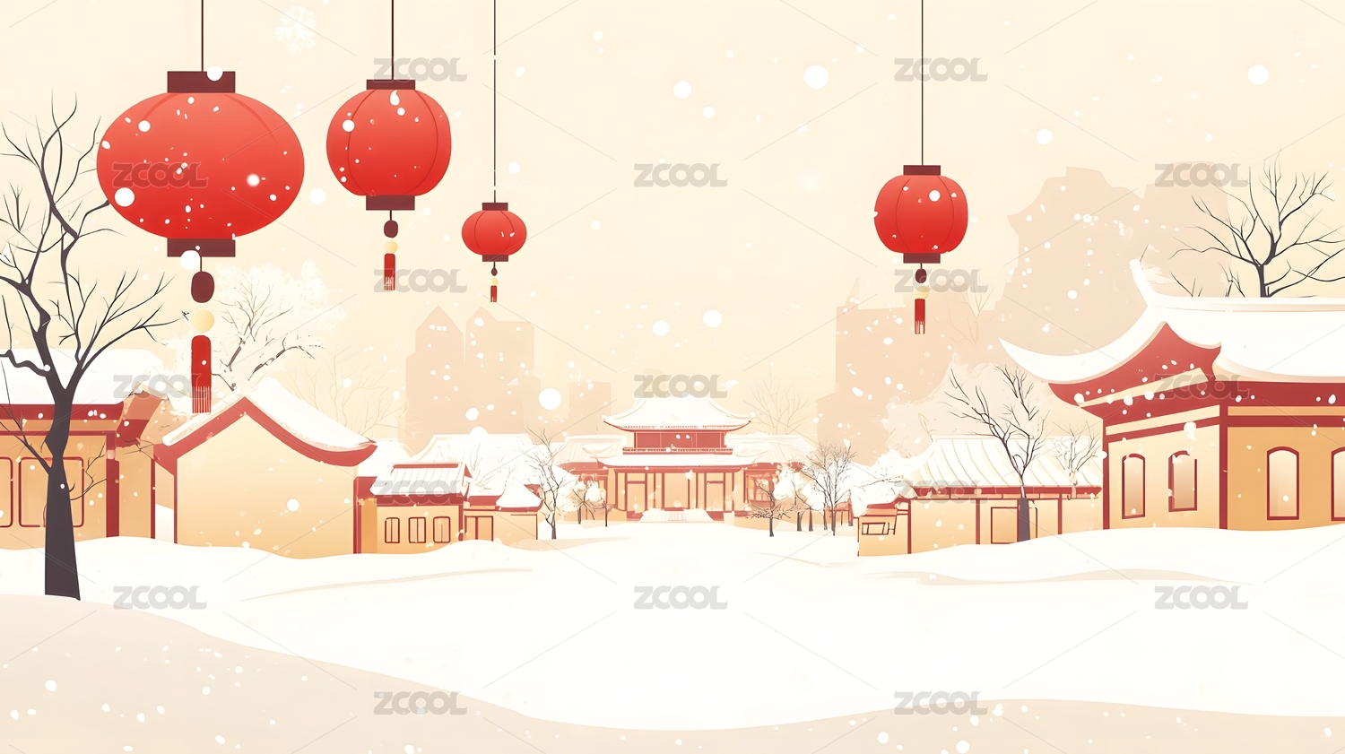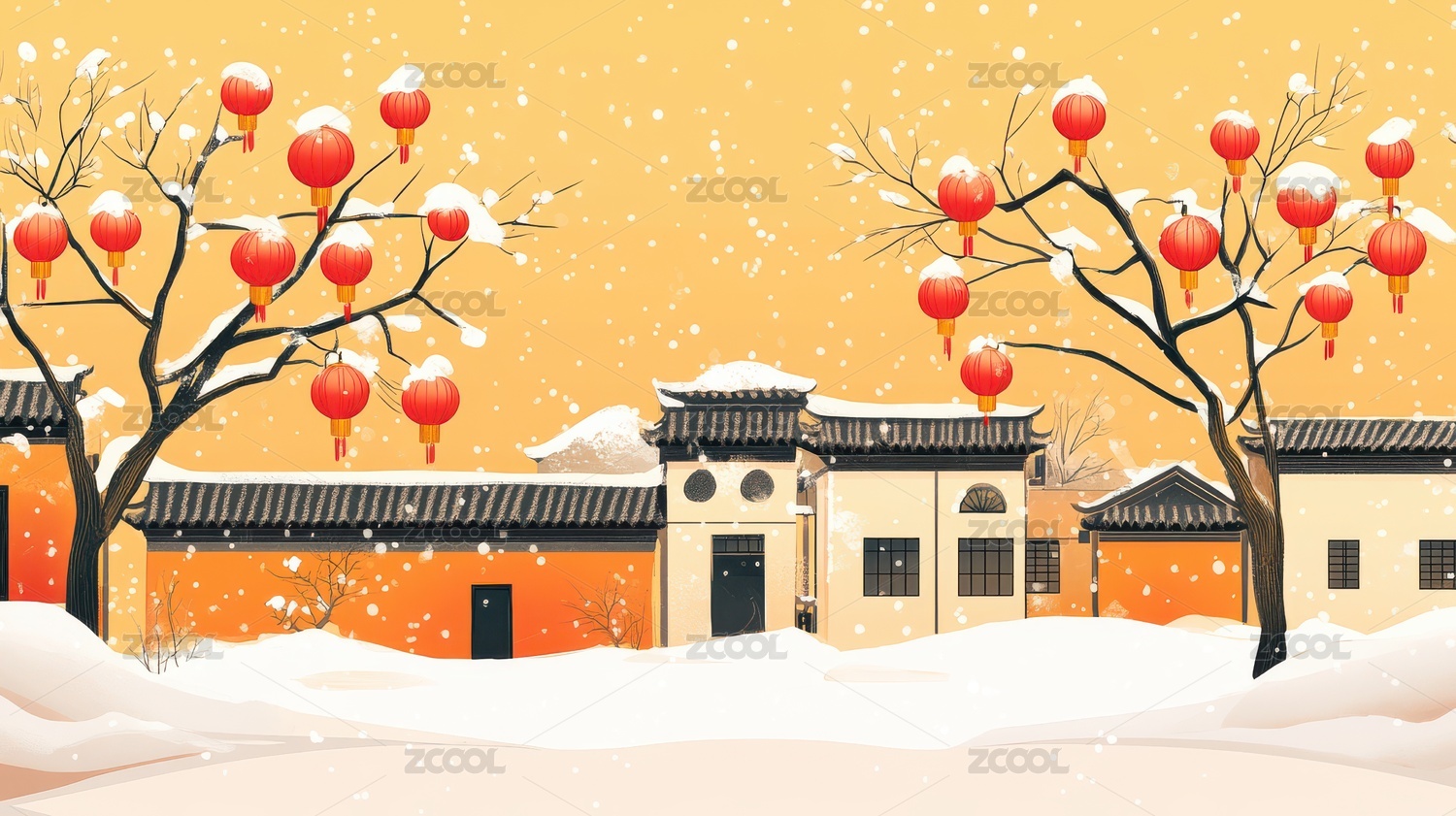建筑,树枝,装饰,屋顶,雪景,冬季,红灯笼,窗户