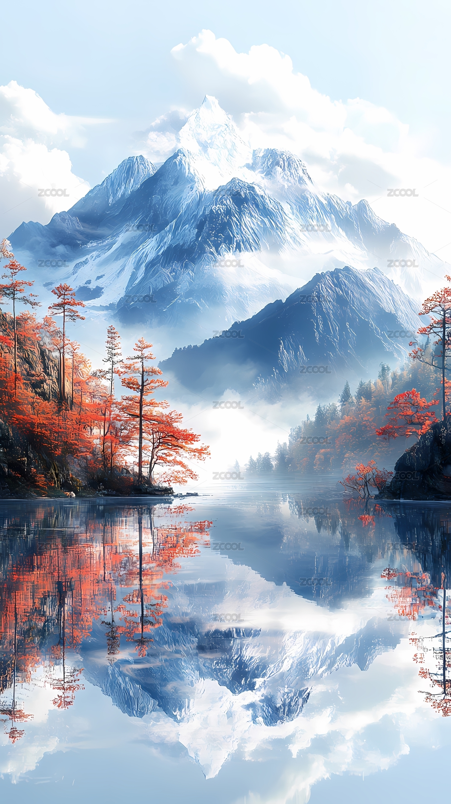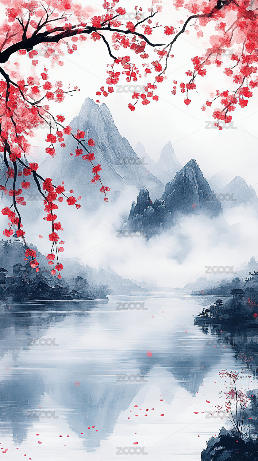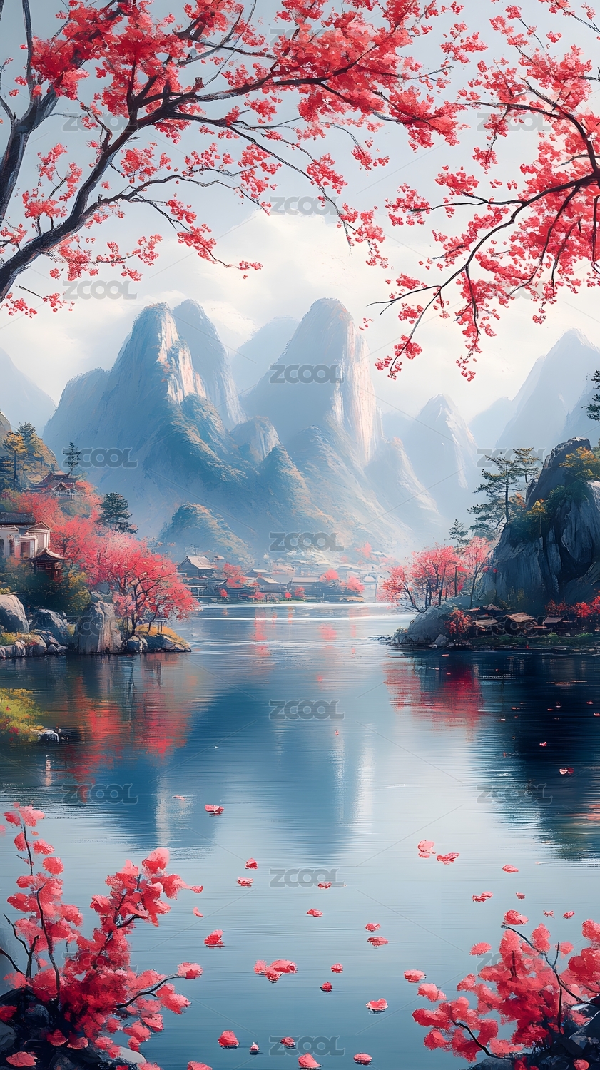 山水,画,意境,秋,树,山,雾,湖,倒影,红叶