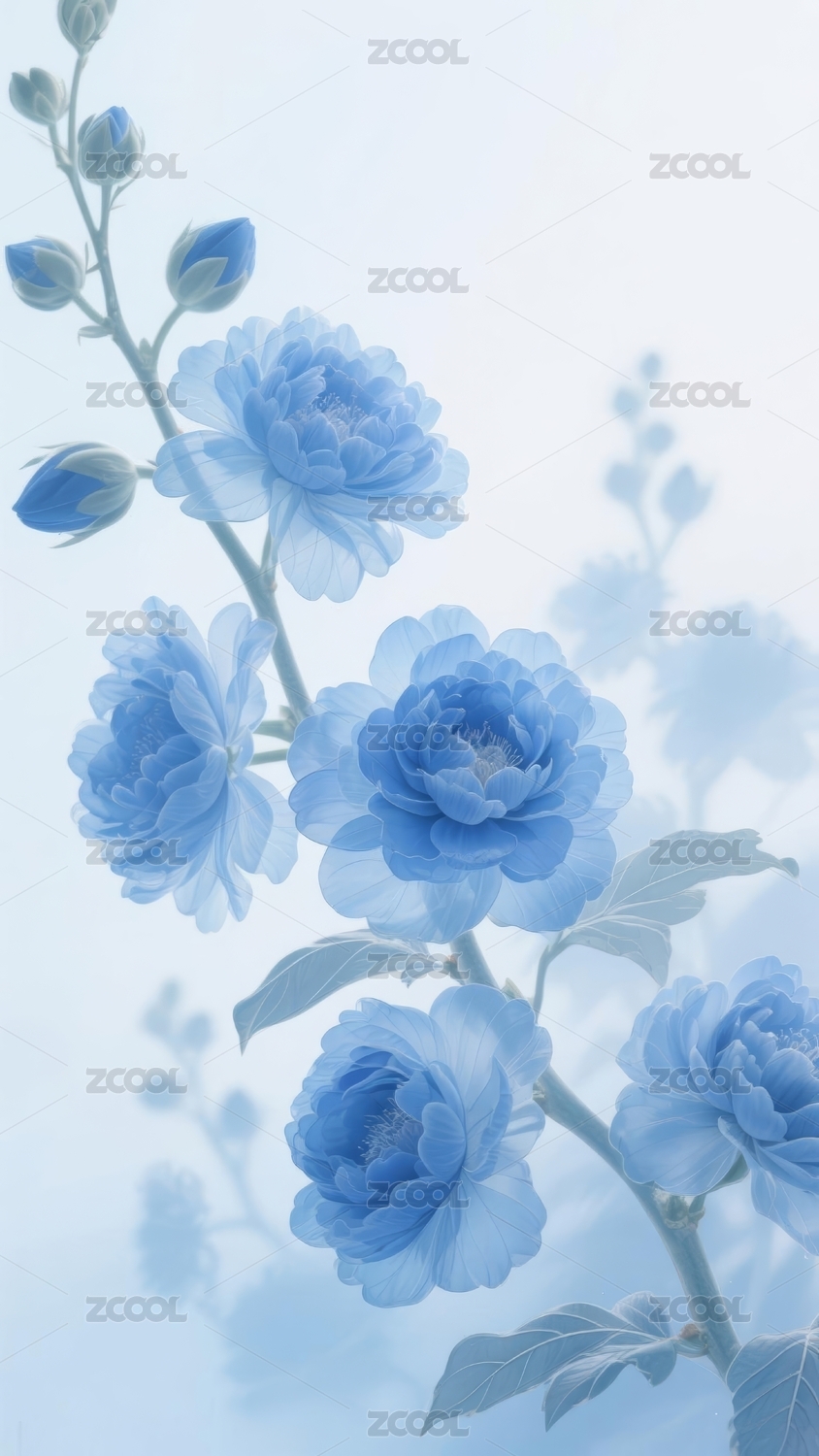 蓝色云纱花朵抽象图形手机端海报背景