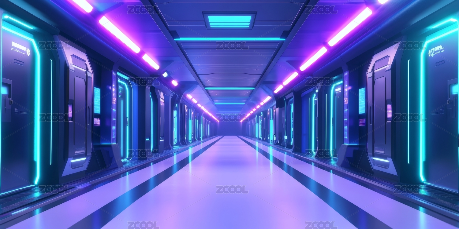 蓝色,深色,科技,现代,紫色,冷色,走廊,灯光装饰,墙壁,门框