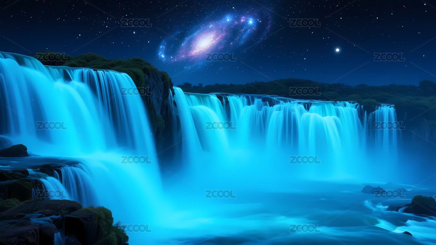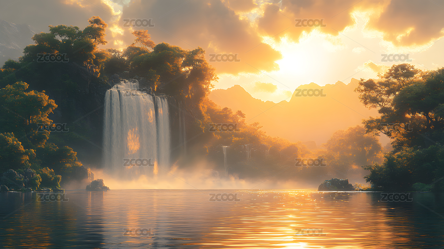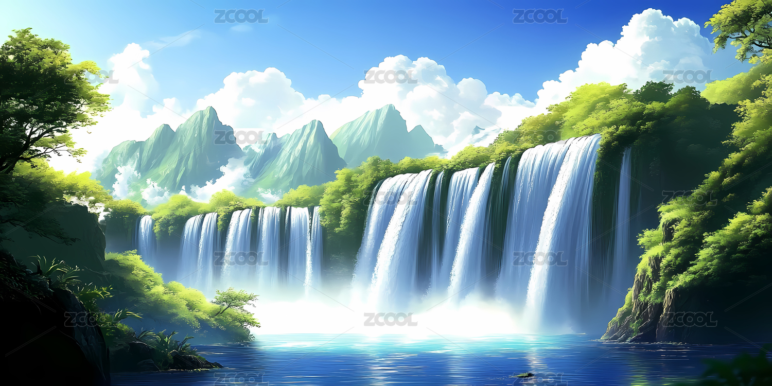 瀑布,水流,蓝色,雾气,湖泊,两岸,植被,宁静,自然,美丽